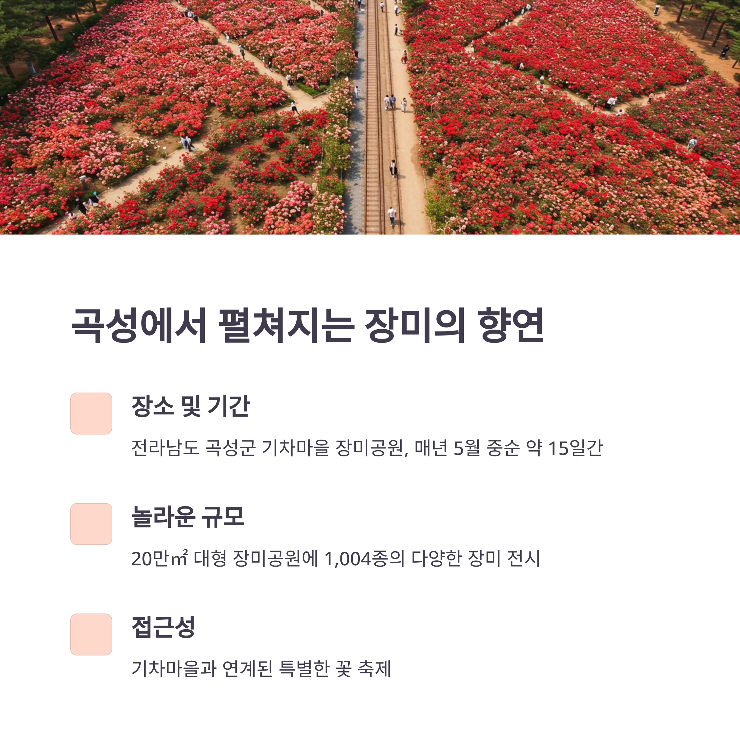 전라남도 곡성군 오곡면에 위치한 기차마을 장미공원에서 진행되며, 약 20만㎡ 규모의 공간에 1,004종의 장미가 심어져 있답니다.