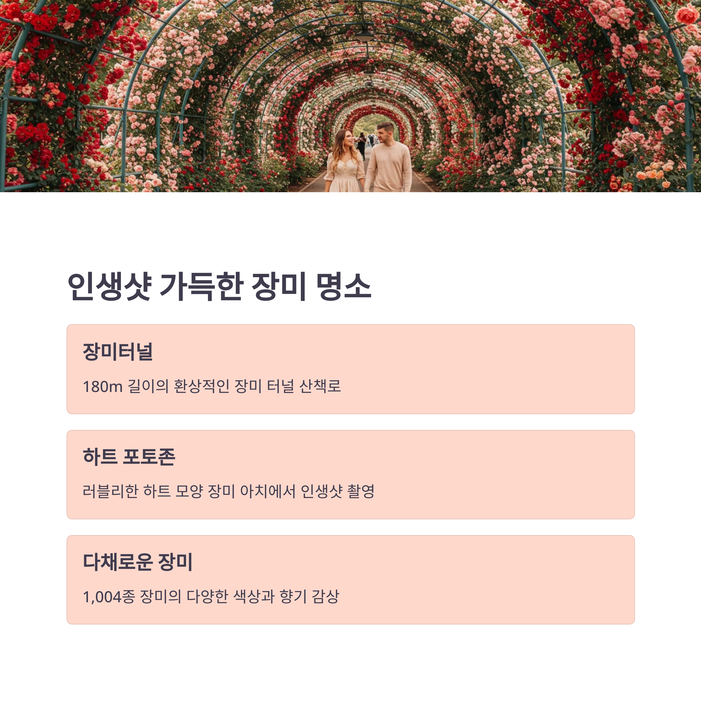 특히 장미터널과 하트 모양의 장미 아치는 꼭 방문해서 사진을 찍어보세요! 인스타그램 피드가 화사해질 거예요. 🌸