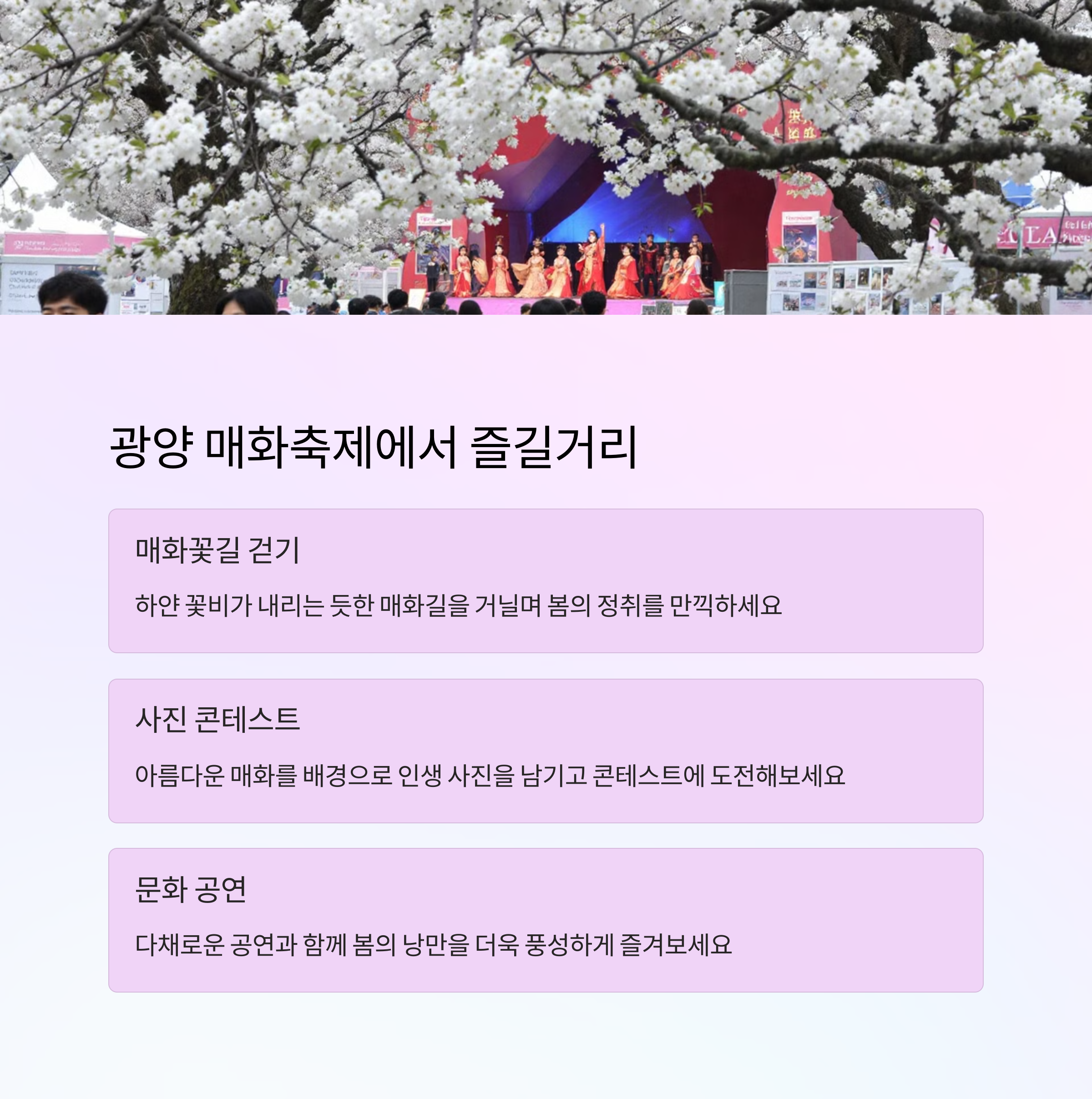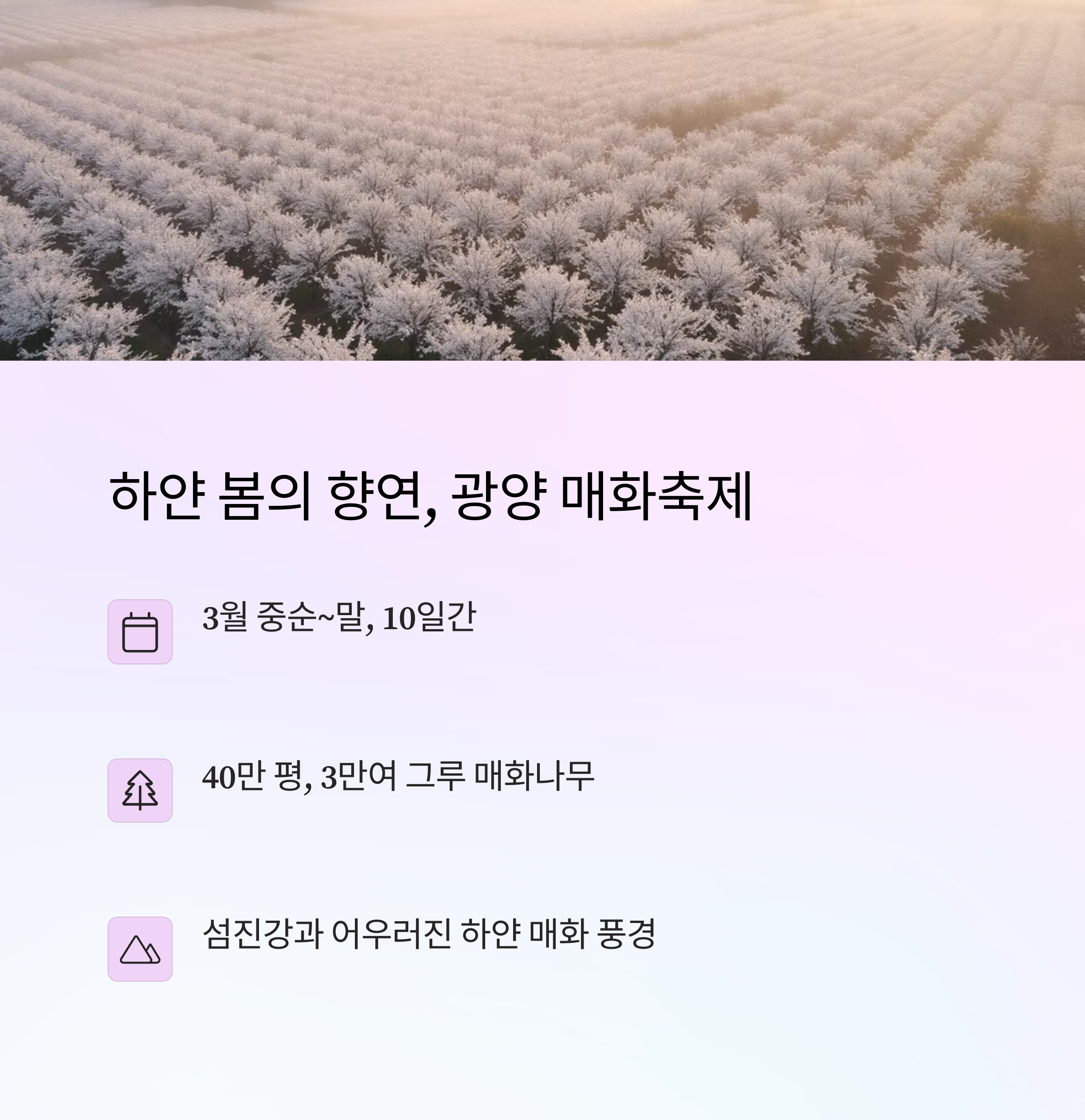 | 광양 매화축제 | 3월 중순~말 (약 10일간) |