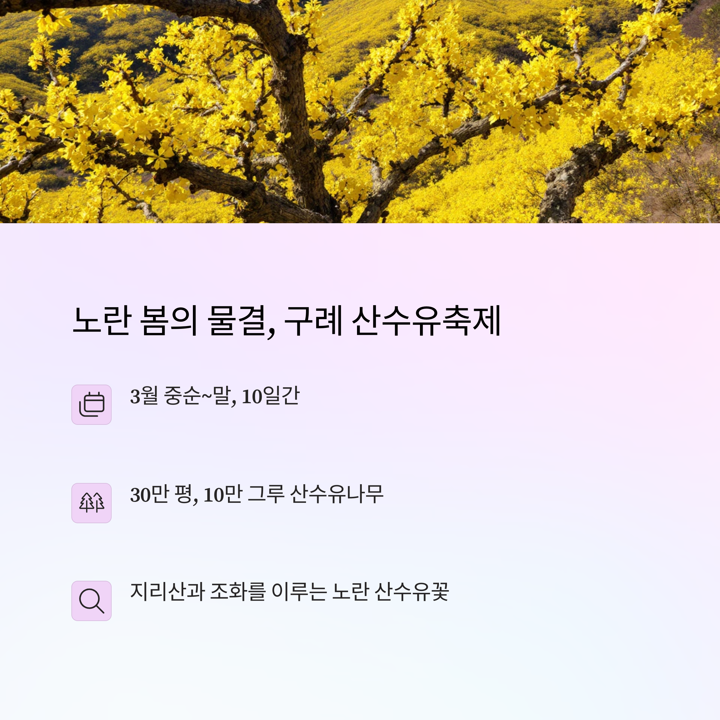 | 구례 산수유축제 | 3월 중순~말 (약 10일간) |