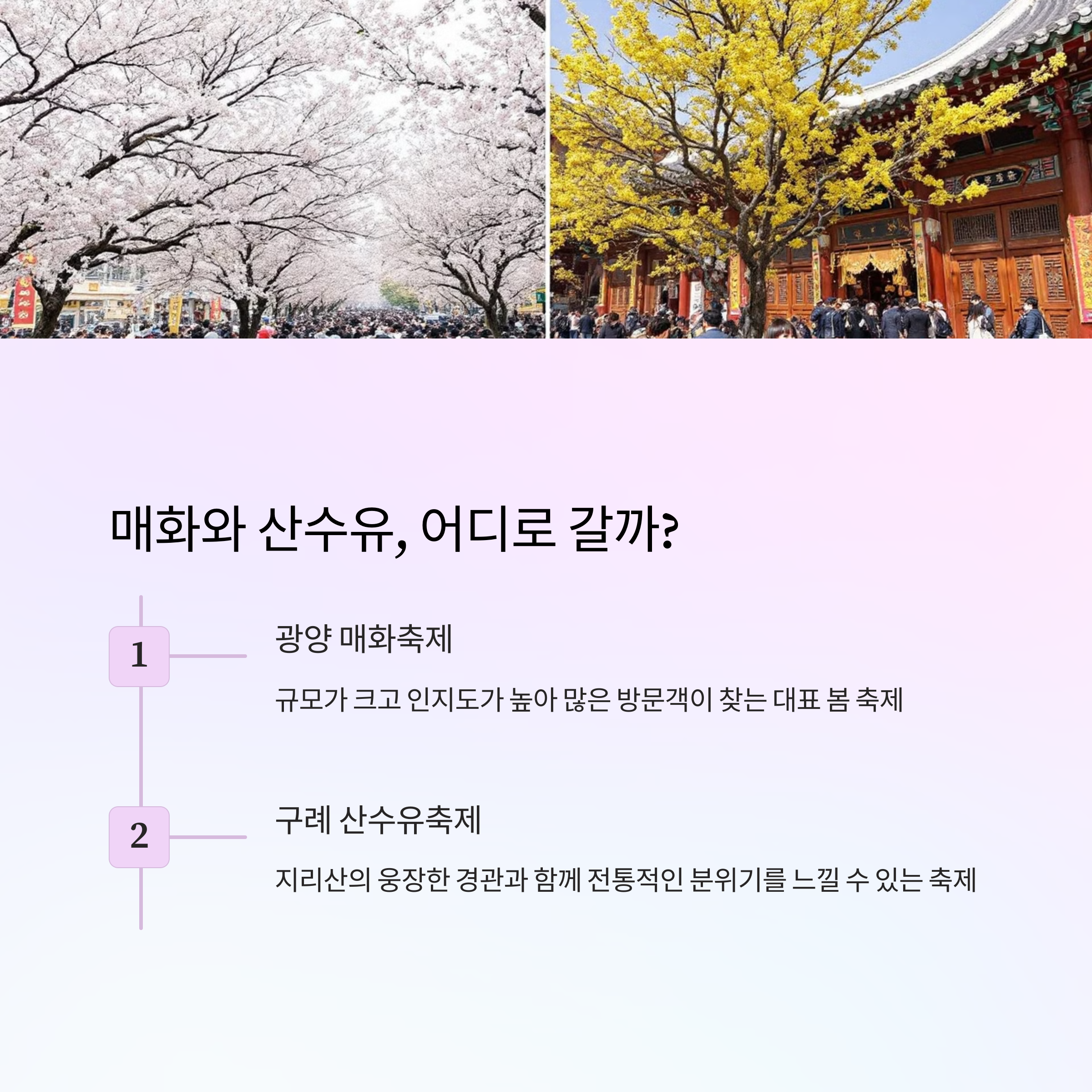 | 축제 차이점 | 하얀 매화 vs 노란 산수유 |