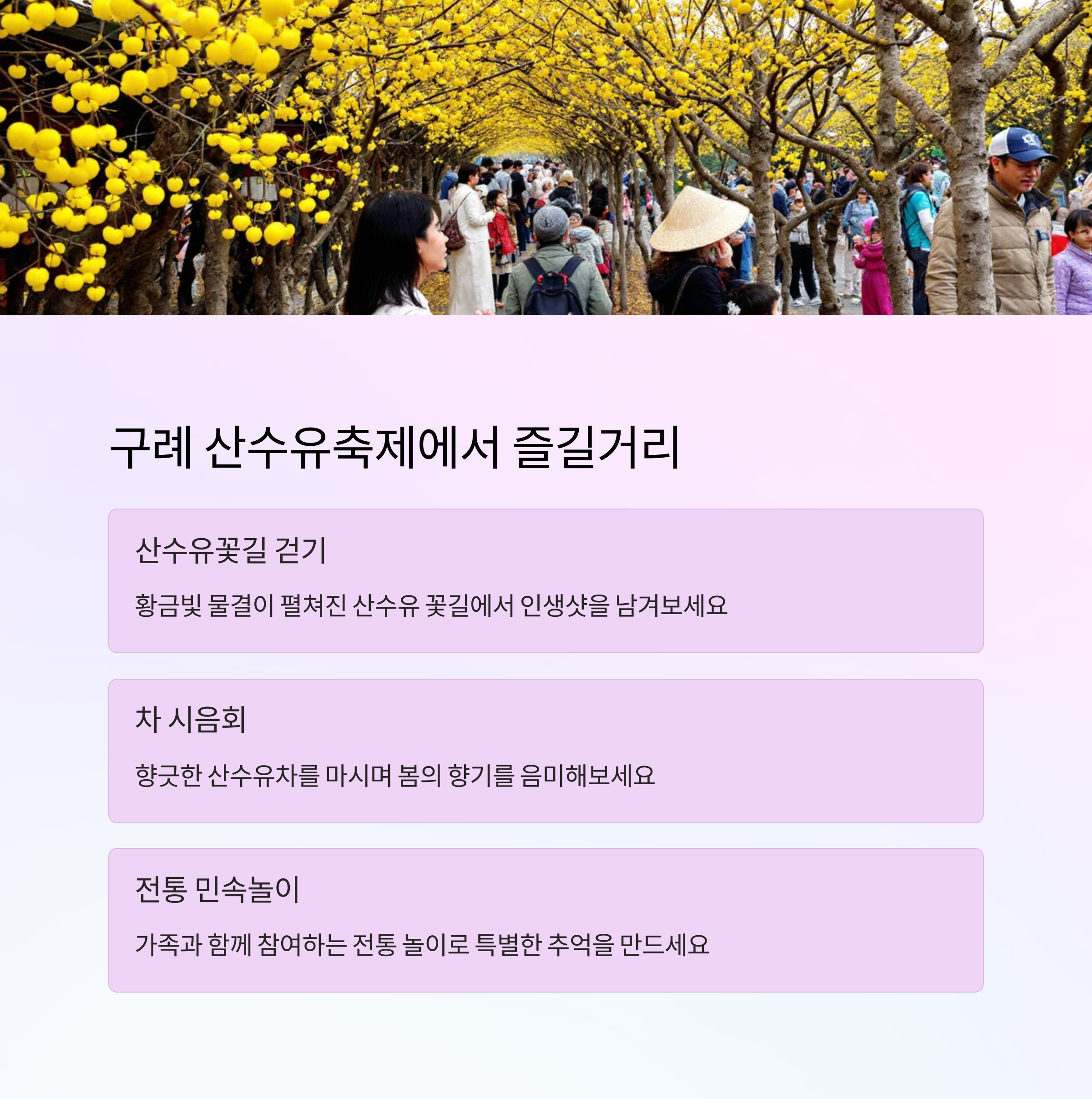 축제 기간에는 산수유꽃길 걷기, 산수유 차 시음회, 전통 민속놀이 등 다양한 프로그램이 운영되고 있어요. 또한 구례의 특산물인 산수유를 활용한 다양한 제품과 음식도 맛볼 수 있답니다.