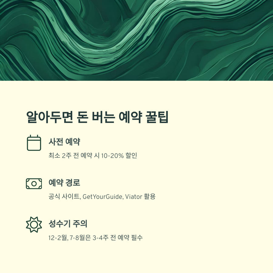 예약 사이트는 클룩(Klook), 익스피디아(Expedia) 같은 대형 플랫폼보다는 공식 사이트나 GetYourGuide, Viator 같은 전문 투어 사이트를 이용하면 더 다양한 옵션과 할인 혜택을 받을 수 있어요.