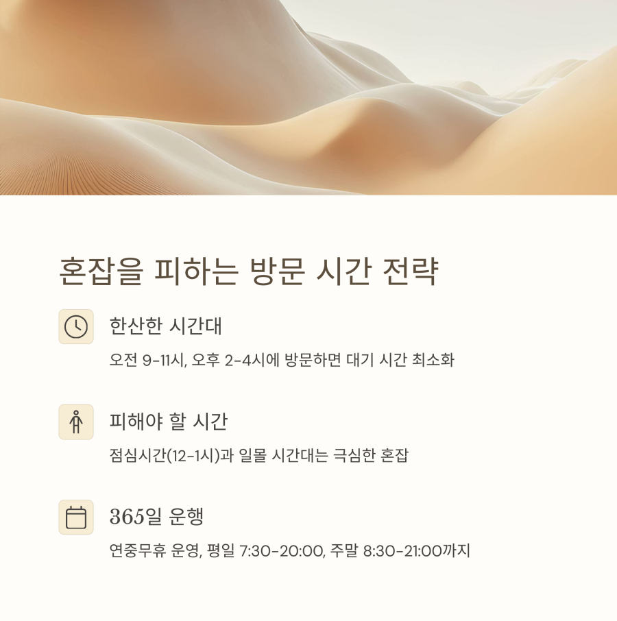 가장 중요한 팁은 방문 시간을 잘 선택하는 것이에요. 보통 오전 9시-11시, 오후 2시-4시 사이가 상대적으로 한산한 편입니다.