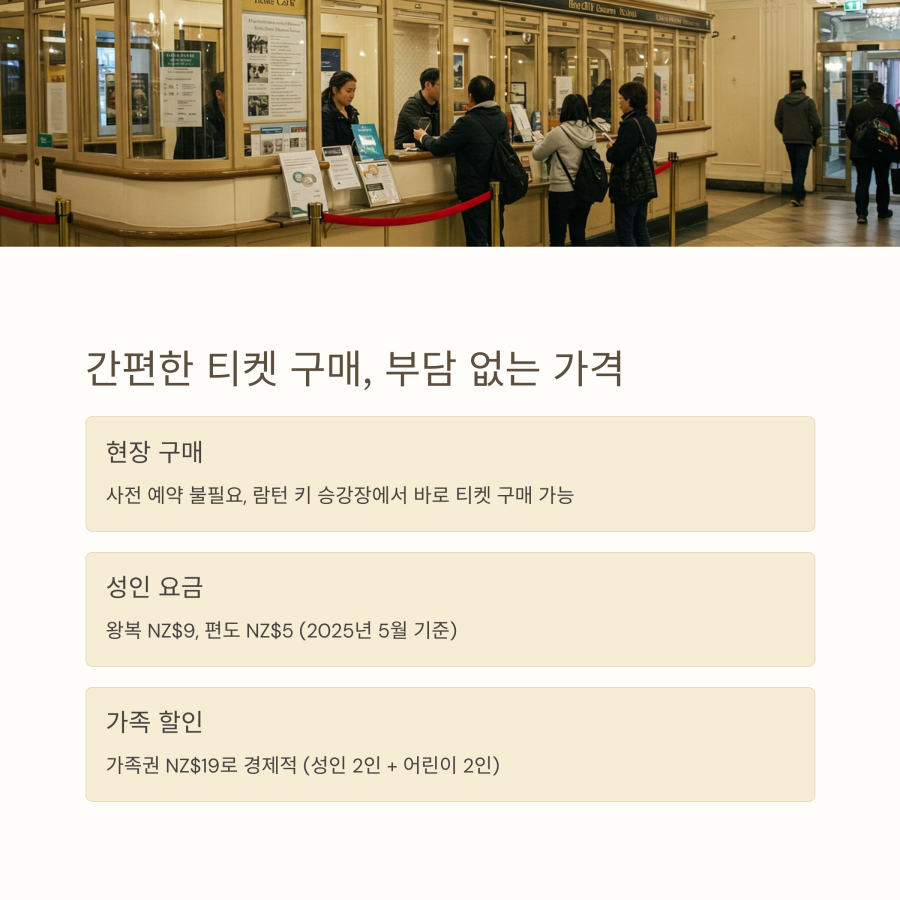 티켓 가격은 성인 기준 편도 NZ$5, 왕복 NZ$9 정도로 매우 합리적인 편이에요. 16세 미만 어린이와 65세 이상 노인은 할인이 적용됩니다.