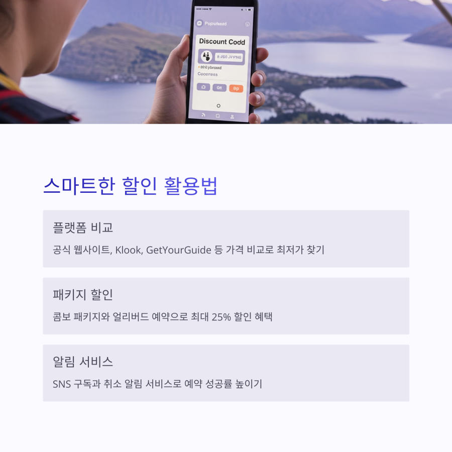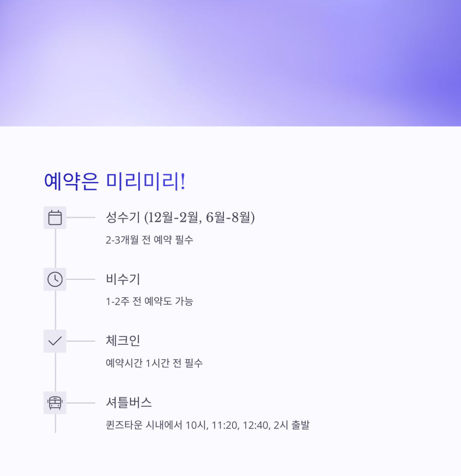 놓치기 쉬운 꿀팁은 현지 호텔 컨시어지 서비스를 활용하는 것! 퀸즈타운에 도착한 후에도 호텔 직원들이 종종 취소된 자리를 확보할 수 있어요. 미리 호텔에 문의해 보세요. 🏨