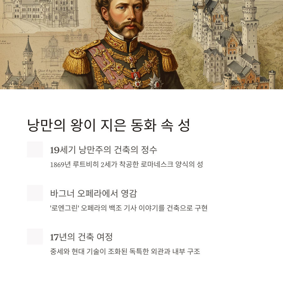 이 성은 바그너의 오페라에서 영감을 받아 지어진 것으로, 내부에는 바그너의 작품에 등장하는 장면들이 벽화로 그려져 있어요. 뛰어난 예술성과 역사적 가치로 인해 유네스코 세계문화유산으로 등재되었습니다.