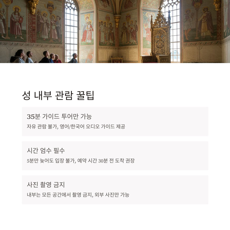 성 내부는 사진 촬영이 금지되어 있으니 주의하세요. 가이드 투어는 약 35분 정도 소요되며, 정해진 시간에 맞춰 입장해야 합니다.