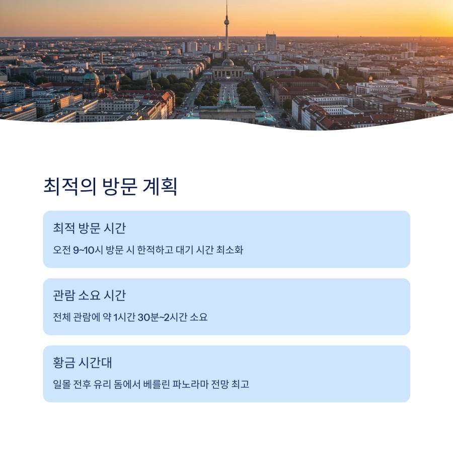 분데슈타크를 방문할 때는 시간대 선택도 중요해요. 일반적으로 오전 9시~10시 사이가 가장 혼잡하지 않은 시간대예요. 특히 평일 오후나 저녁 시간대는 상대적으로 여유롭게 관람할 수 있답니다.