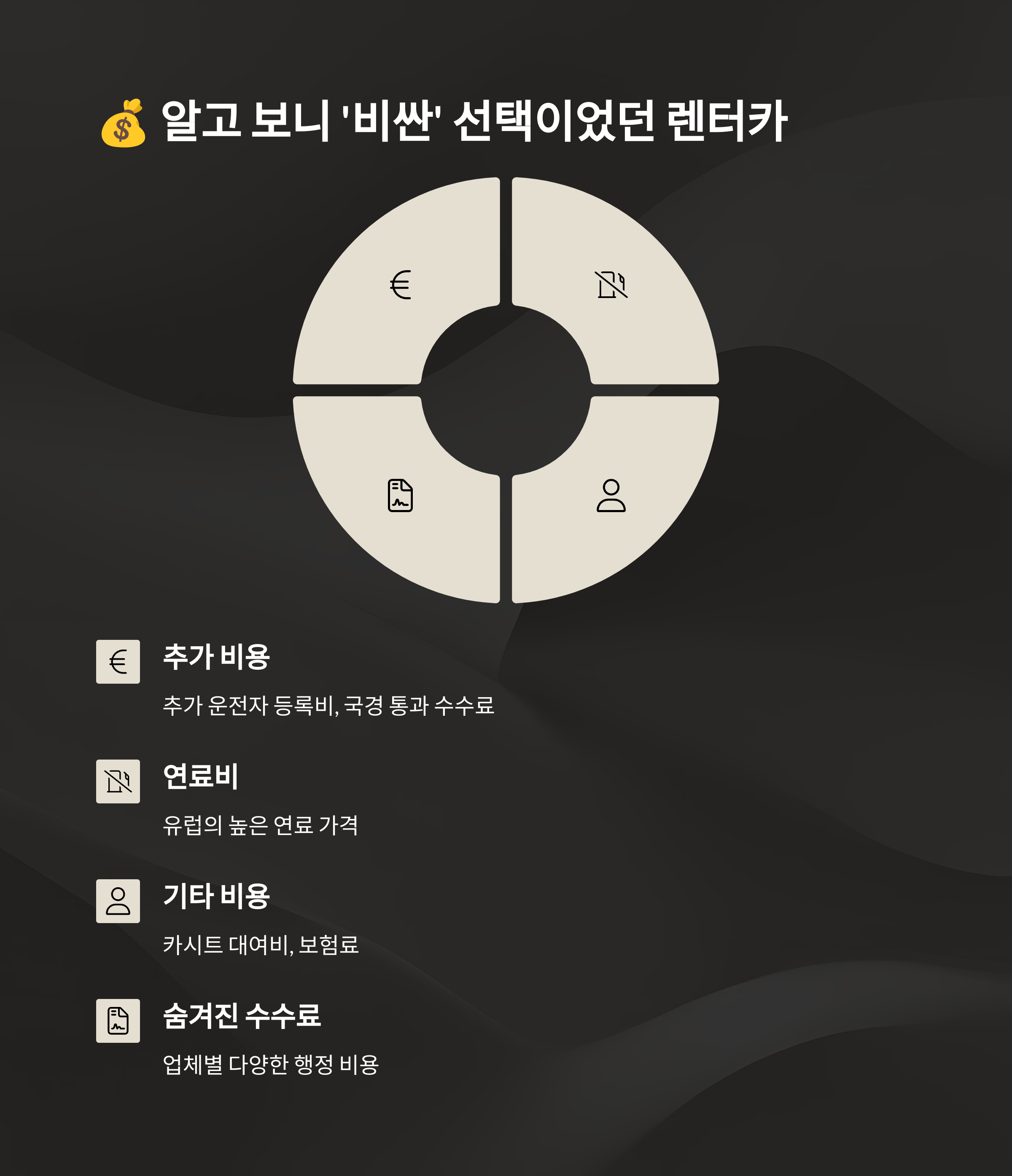A: 숨겨진 추가 비용이에요. 기본 렌탈 요금 외에도 추가 운전자 등록비, 국경 통과 비용, 편도 반납 비용, 젊은 운전자 추가 요금(보통 25세 미만) 등 생각보다 많은 비용이 발생할 수 있어요. 계약서를 꼼꼼히 확인하는 것이 중요해요.