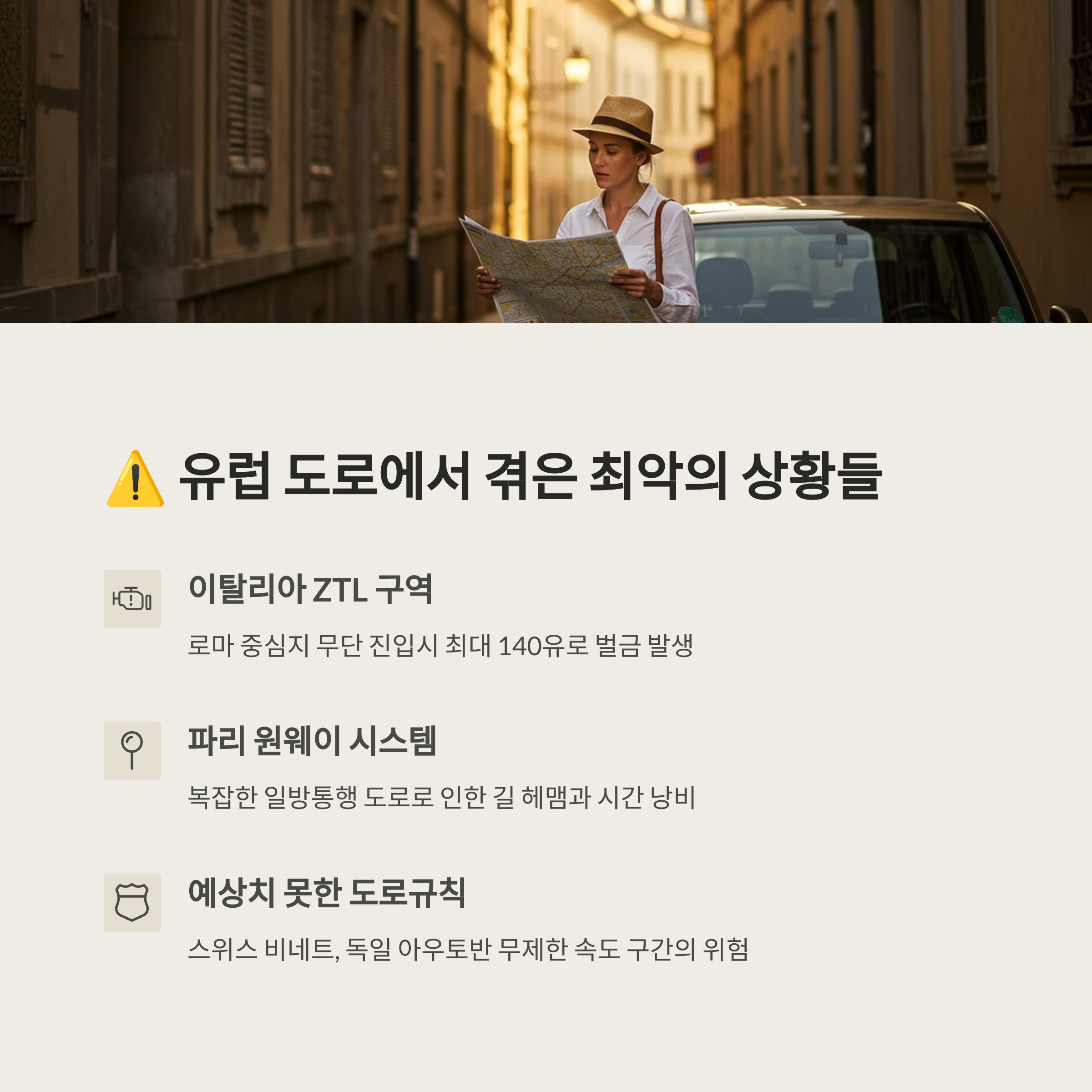 | 이탈리아 | ZTL 제한구역 많음 | 도심 진입 시 ZTL 지도 확인 |