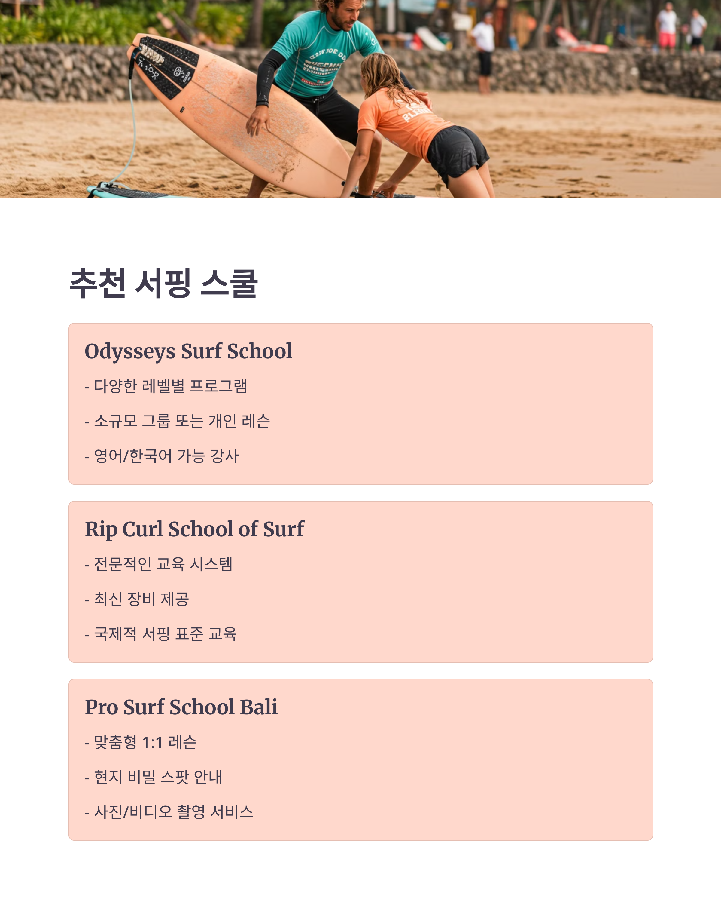 발리에는 많은 서핑 스쿨이 있지만, 그중에서도 Odysseys Surf School과 Rip Curl School of Surf는 전문적인 강사진과 체계적인 커리큘럼으로 높은 평가를 받고 있어요.