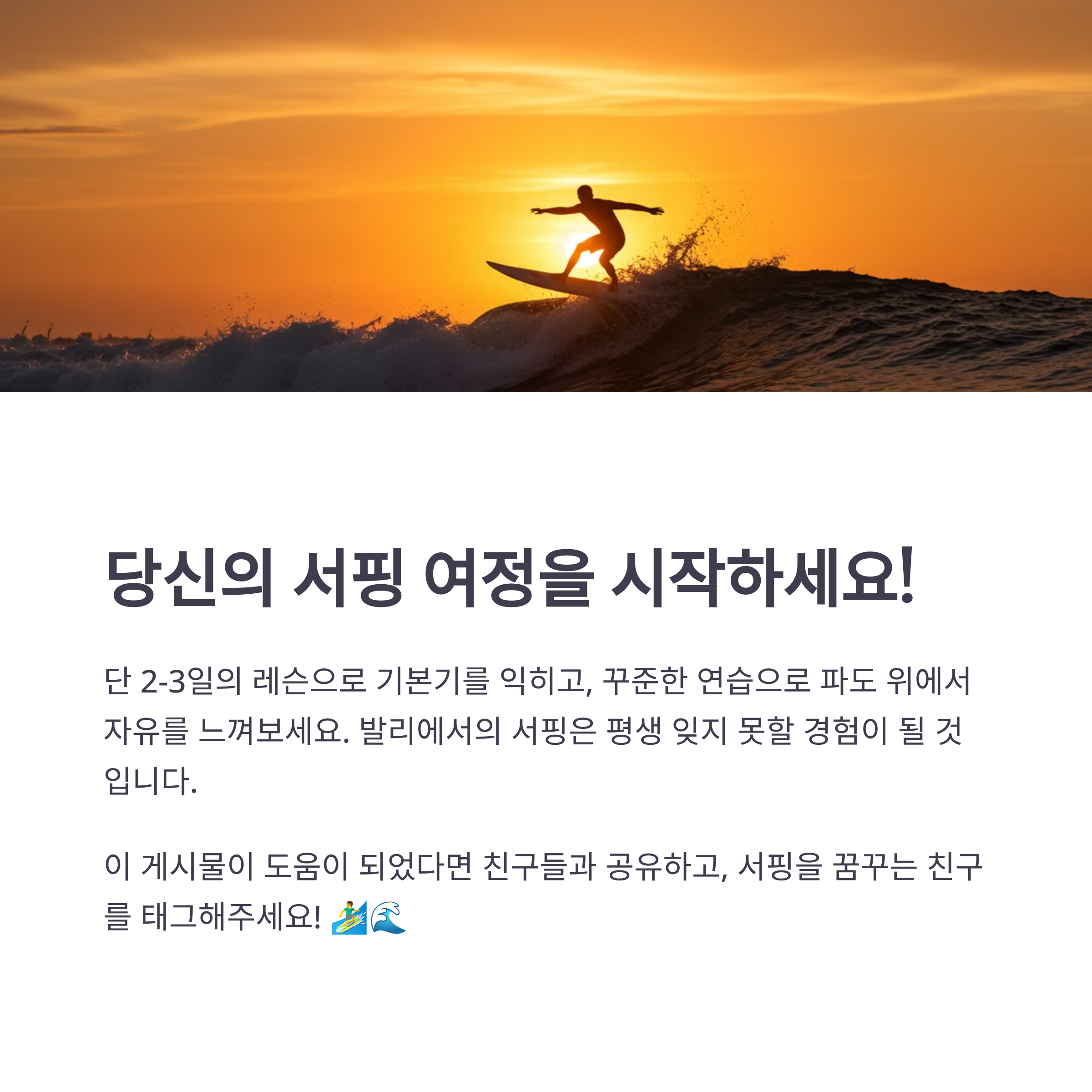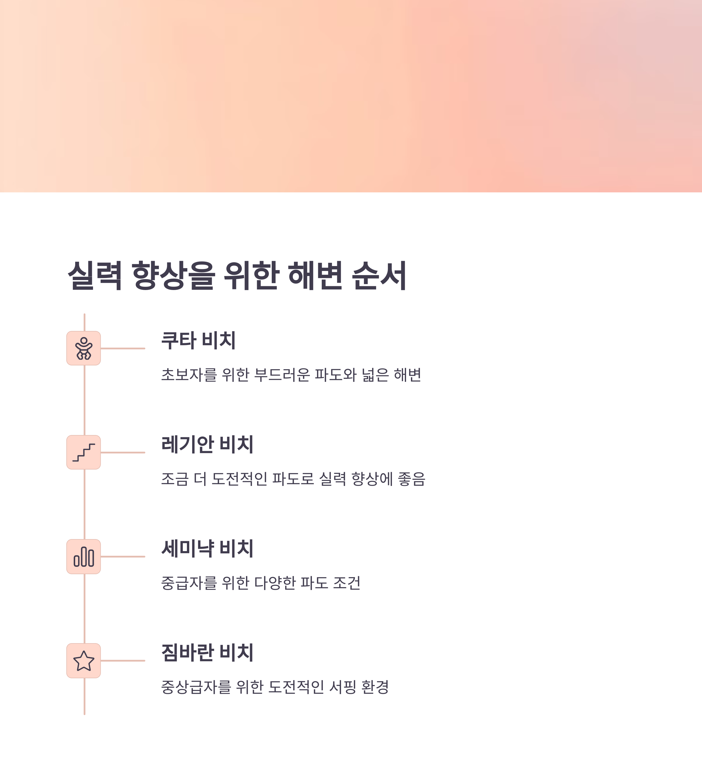 처음엔 쿠타 비치에서 기본기를 익히고, 점차 다른 해변으로 도전의 폭을 넓혀가세요. 어느새 여러분도 파도 위에서 자유롭게 춤추는 자신을 발견하게 될 거예요!