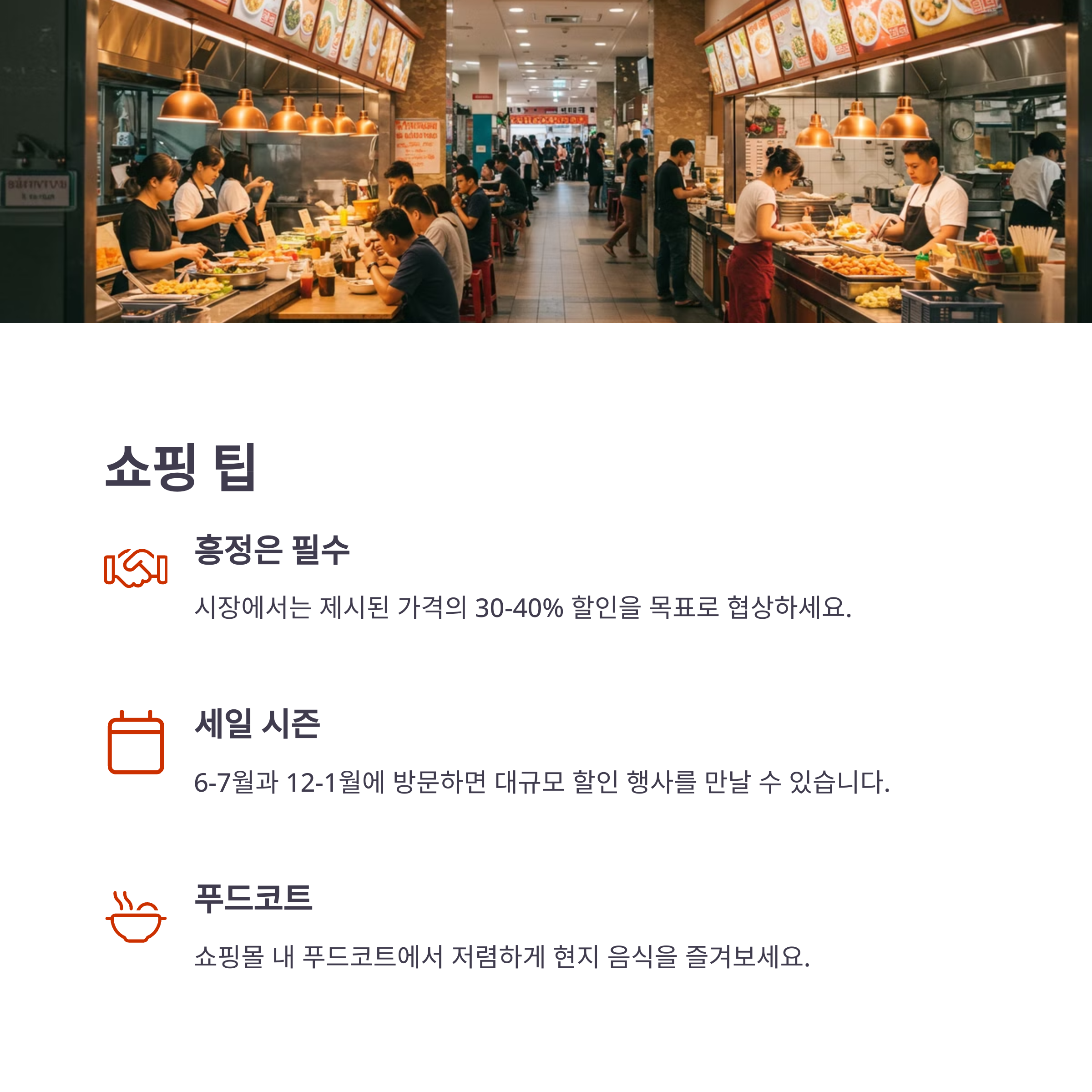 쇼핑몰 선택 시에는 세일 기간을 체크하는 것도 중요해요! 태국의 대규모 세일은 보통 6-7월과 12-1월에 진행된답니다. 이 시기에 방문하시면 더 알뜰하게 쇼핑할 수 있어요. 😊