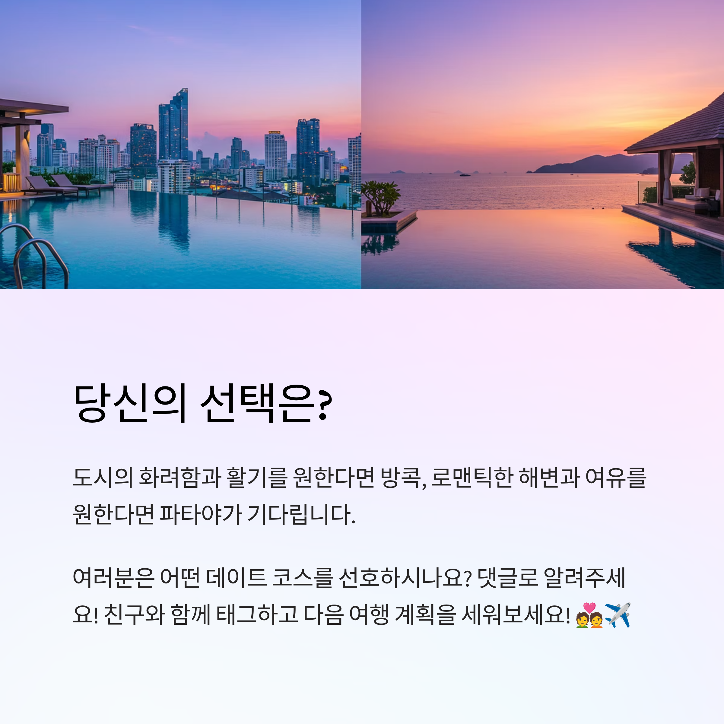 안녕하세요~ 오늘은 태국 여행의 인기 도시 방콕과 파타야를 비교해보며 커플 여행으로 어떤 곳이 더 적합한지 살펴보려고 해요. 로맨틱한 시간을 만들고 싶은 커플들에게 도움이 될 정보를 준비했답니다! 😊