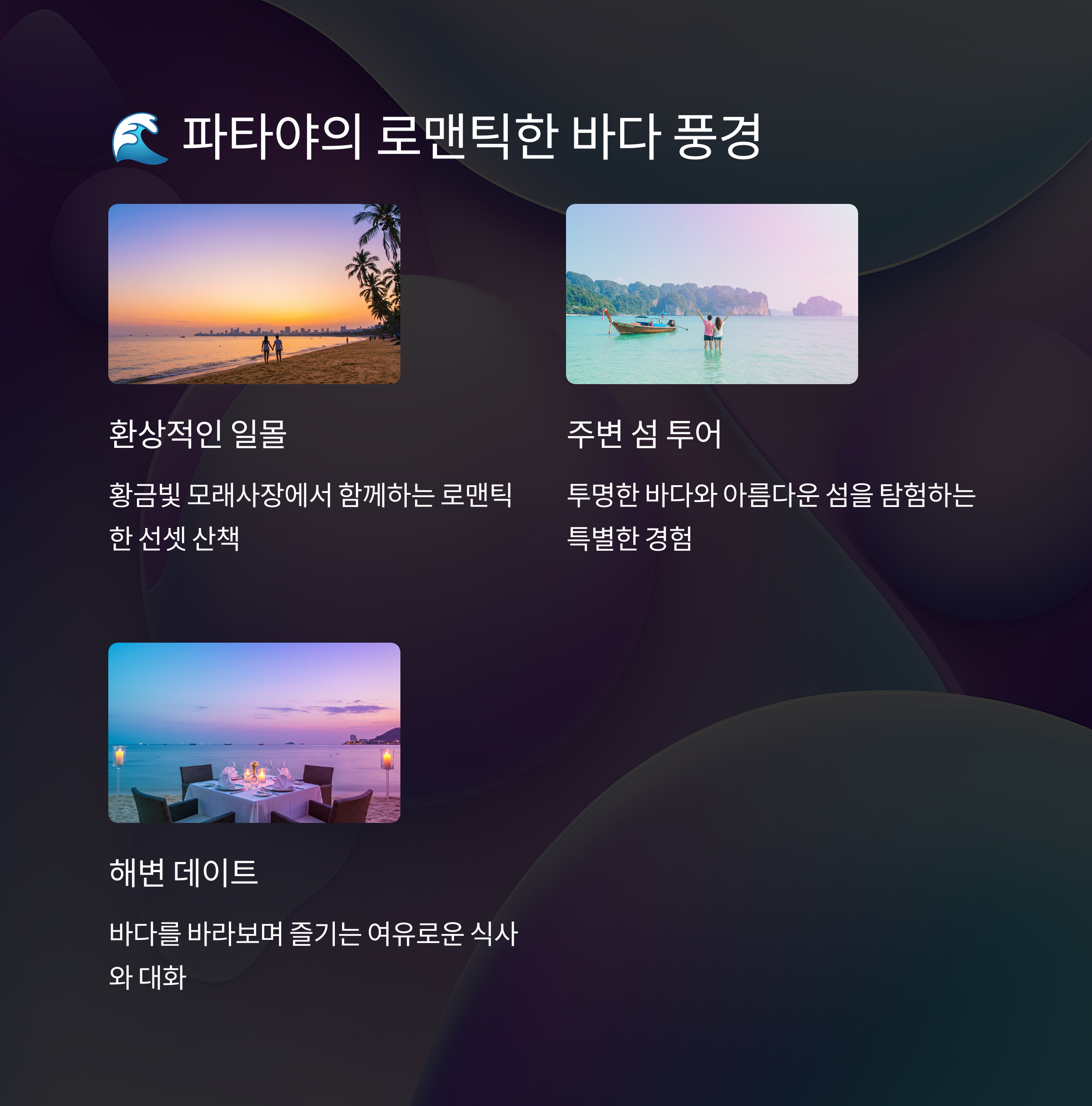 파타야는 방콕에서 약 2시간 거리에 위치한 해변 도시로, 아름다운 바다와 휴양지 분위기를 원하는 커플에게 딱이에요! 🌴