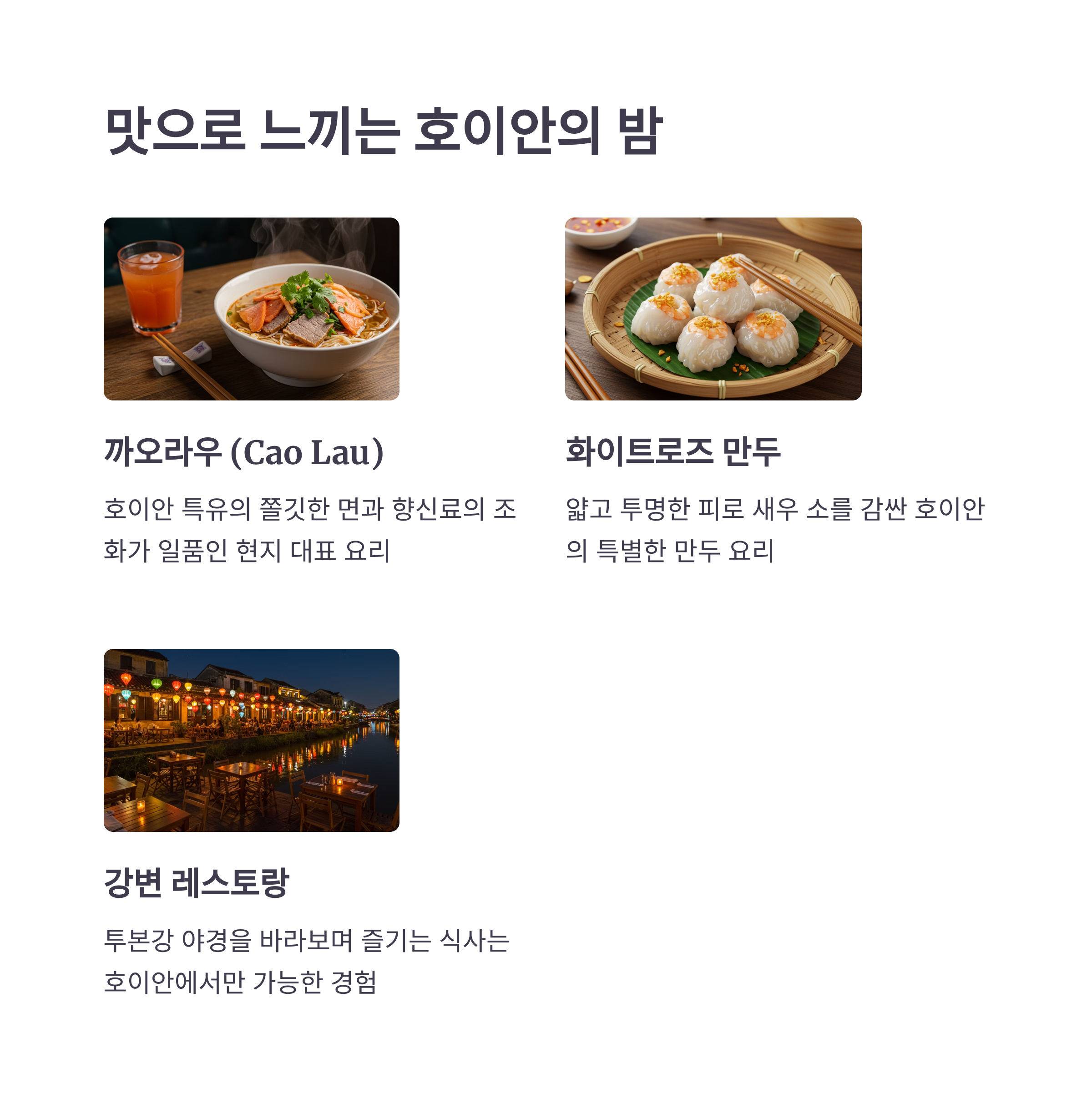 호이안의 맛집들을 방문해 현지 요리의 진수를 경험해보세요. 투본강 주변의 레스토랑에서는 야경을 감상하며 로맨틱한 저녁 식사를 즐길 수 있답니다.