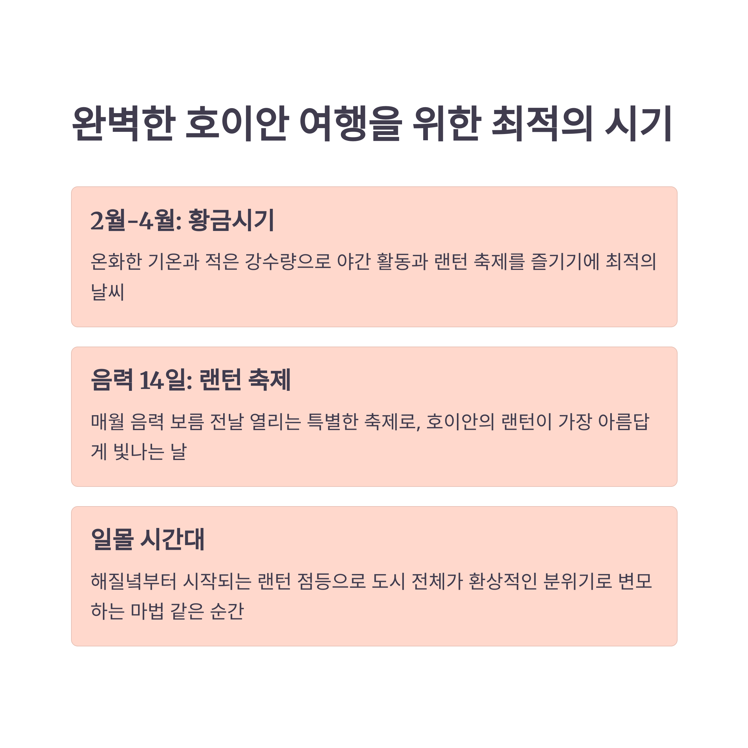 호이안을 방문하기 가장 좋은 시기는 2월부터 4월사이입니다. 이 시기에는 날씨가 온화하고 비가 적게 와서 야경을 즐기기에 최적의 조건이에요.
