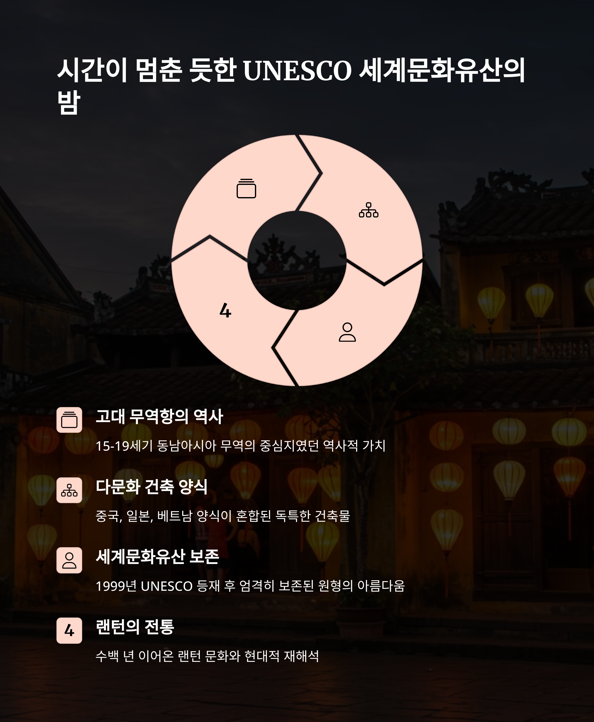 랜턴의 따스한 불빛 아래 걷다 보면, 시간이 멈춘 듯한 느낌을 받게 될 거예요. 현대적인 도시의 화려한 네온사인이 아닌, 전통의 아름다움이 살아 숨쉬는 호이안의 밤을 경험해보세요.