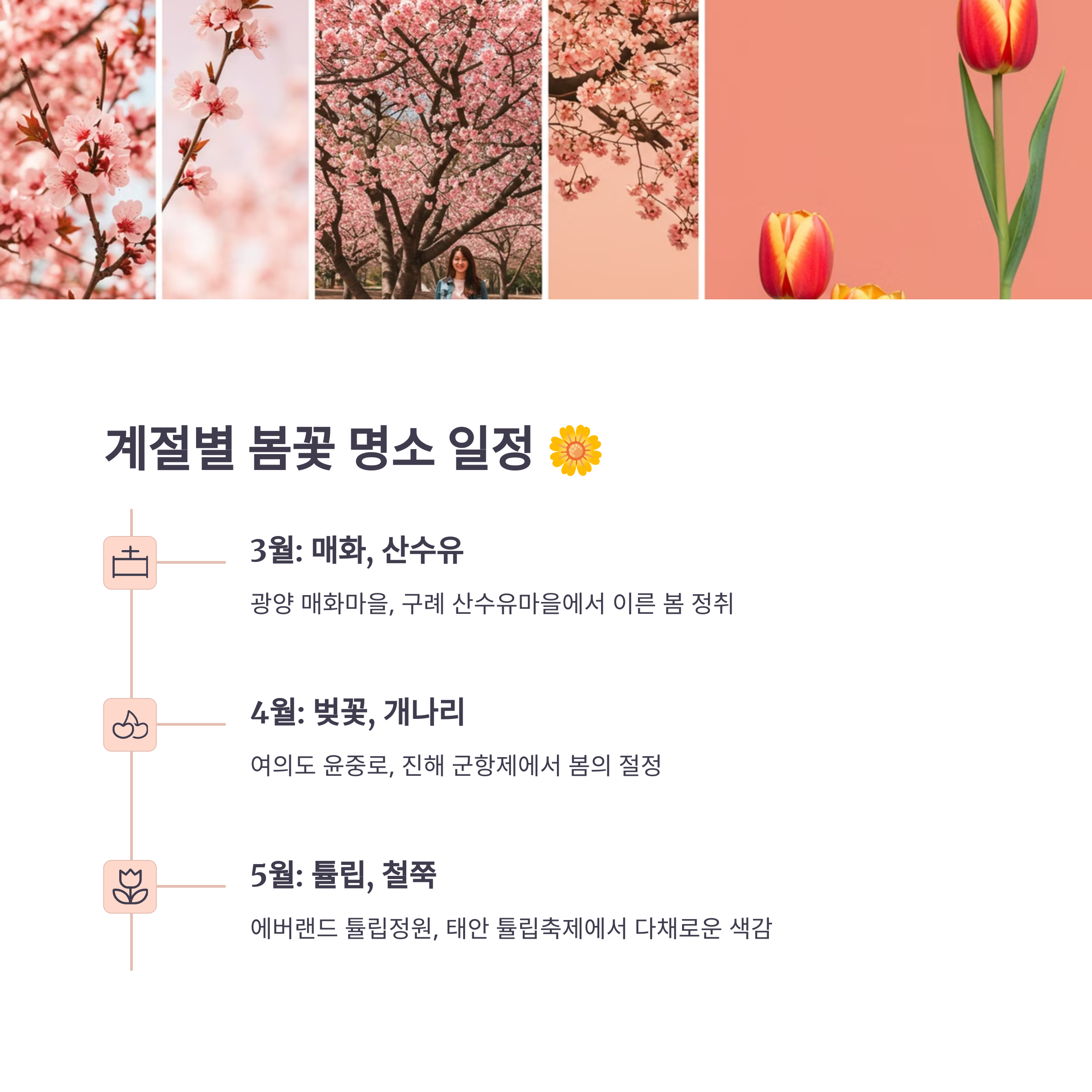 3월에는 매화와 산수유, 4월에는 벚꽃과 개나리, 5월에는 튤립과 철쭉이 절정을 이루죠. 🌼