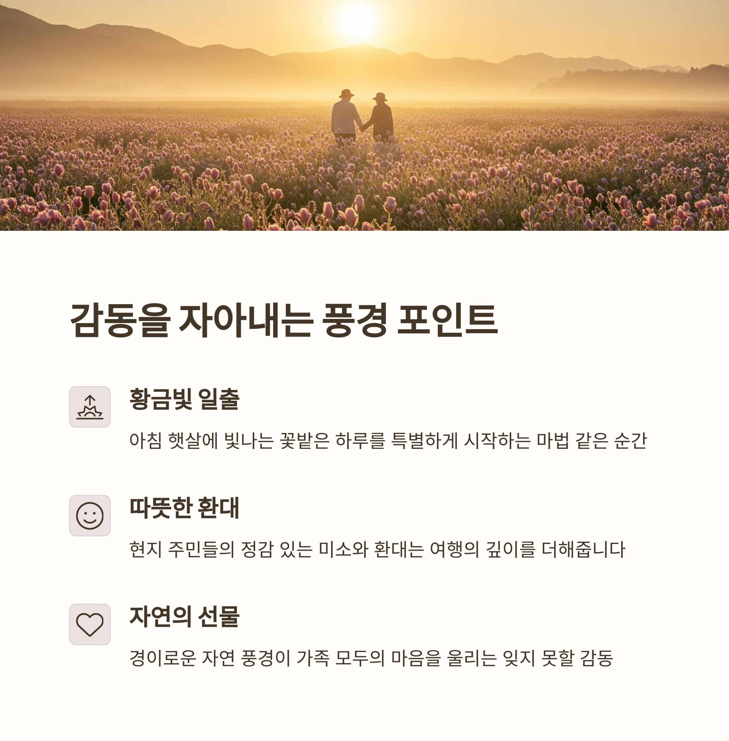 특히 일출을 바라보던 순간은 잊을 수 없어요. 산 너머로 떠오르는 태양과 함께 꽃들이 서서히 빛을 받아 반짝이던 그 풍경은 말로 표현하기 어려울 정도로 아름다웠어요. 부모님과 함께 그 순간을 공유할 수 있어서 더욱 값진 시간이었죠. 🌅