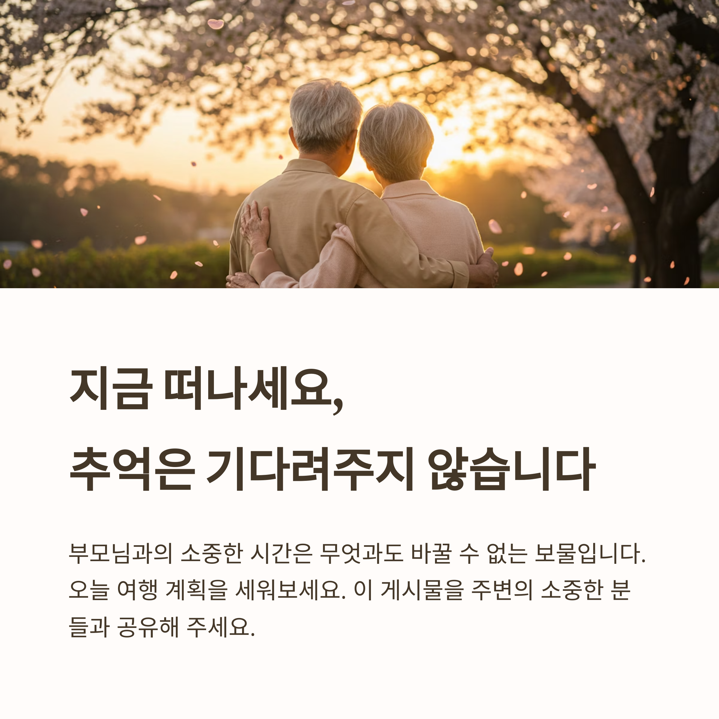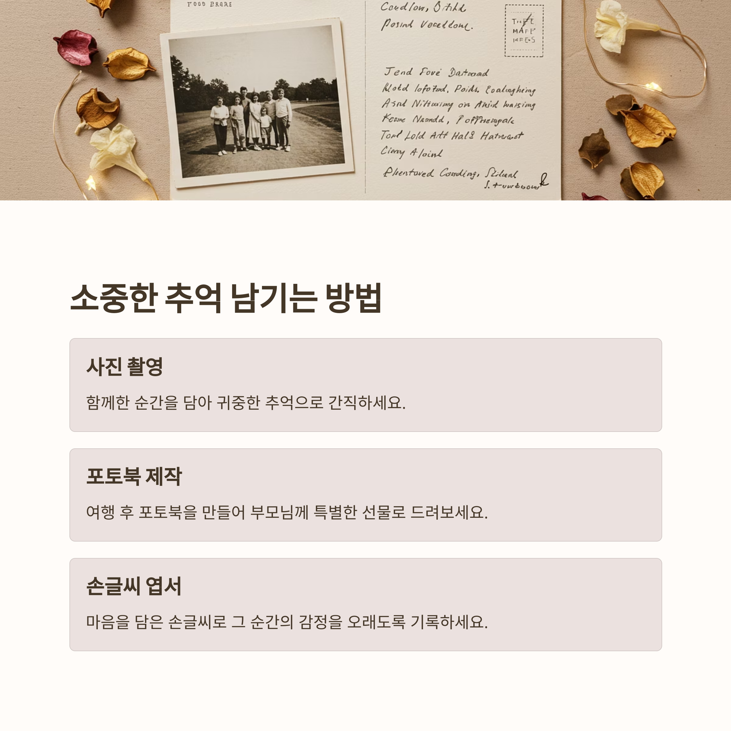 특히 부모님의 연세가 높아질수록 함께하는 시간의 소중함은 더욱 커져요. 건강이 허락할 때 부모님과 함께 좋은 곳을 다니며 추억을 쌓는 것은 나중에 돌아보았을 때 무엇과도 바꿀 수 없는 보물이 된답니다.
