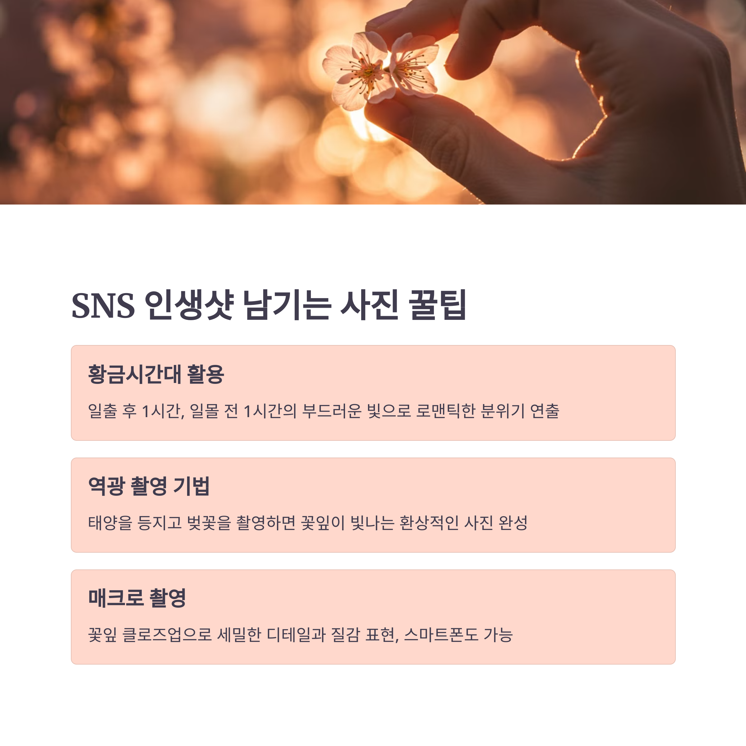 | 일출 직후나 일몰 직전의 황금시간(Golden Hour)에 벚꽃이 가장 아름답게 보입니다. 빛이 부드럽게 퍼지는 이 시간대에 방문하면 환상적인 사진을 남길 수 있습니다. |