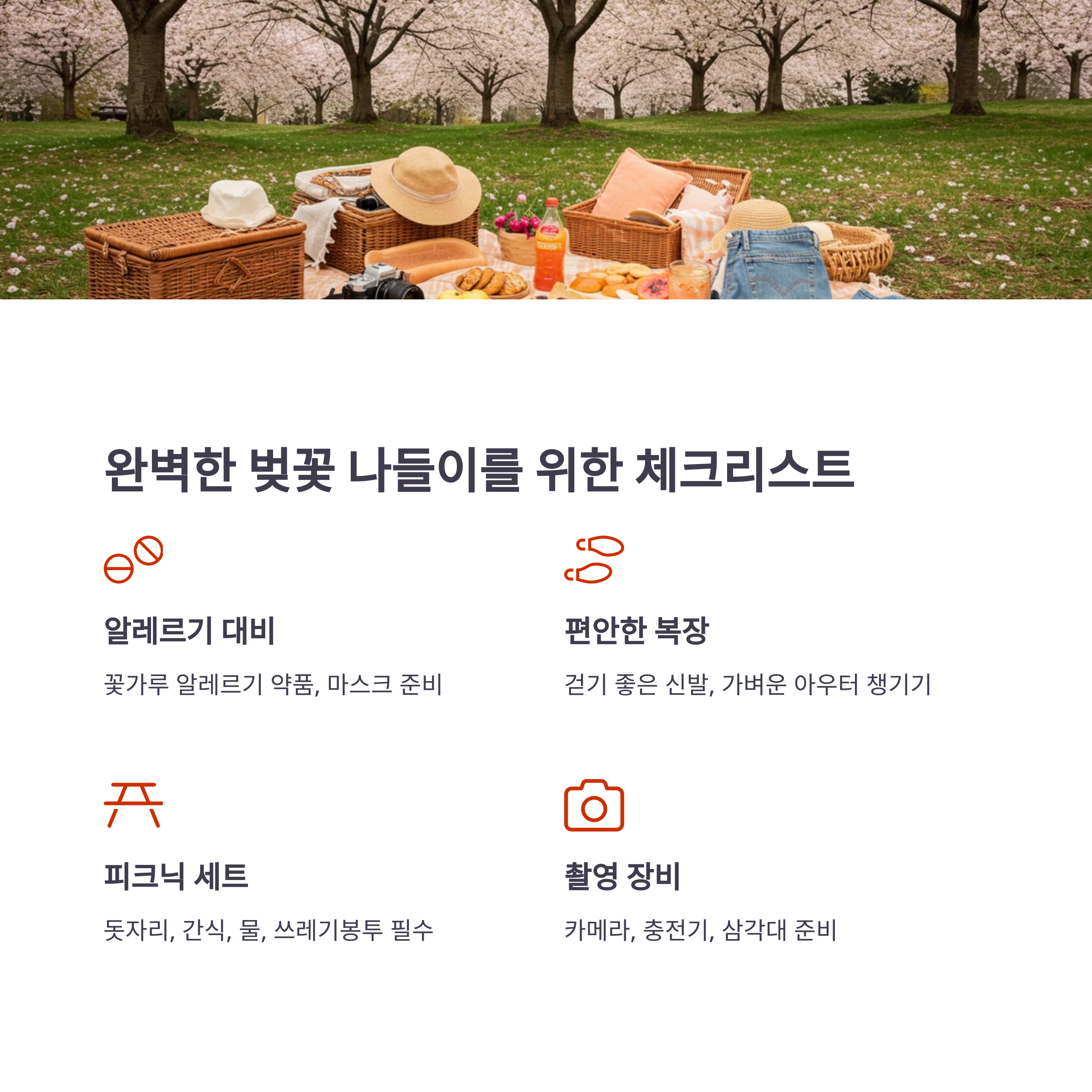✅ 벚꽃 여행을 더욱 즐겁게 만들어 줄 준비물과 주의사항을 알려드릴게요.
