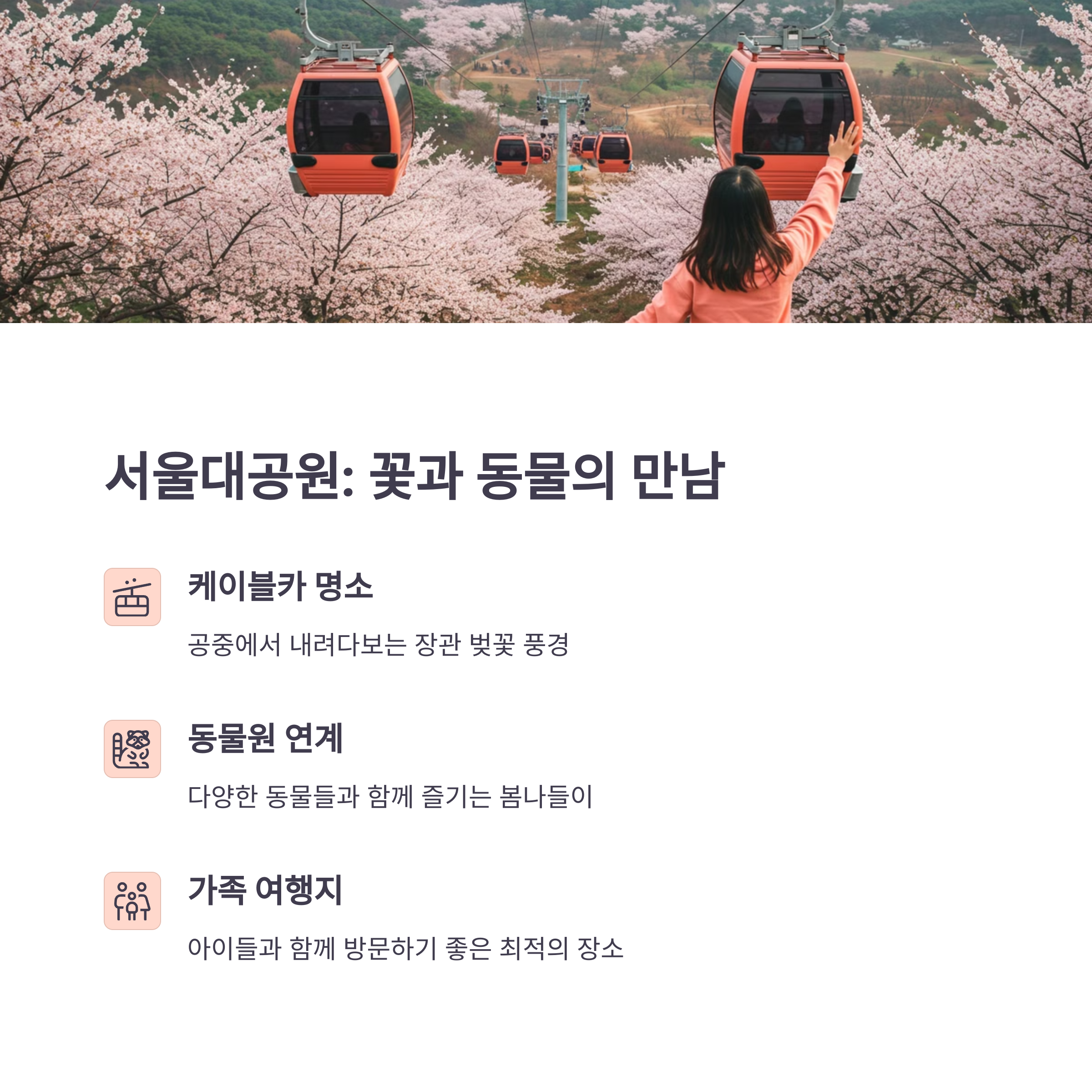 🌸 첫 번째로 소개해드릴 곳은 경기도 과천 서울대공원이에요. 넓은 공원 전체가 벚꽃으로 뒤덮이는 장관을 볼 수 있답니다.
