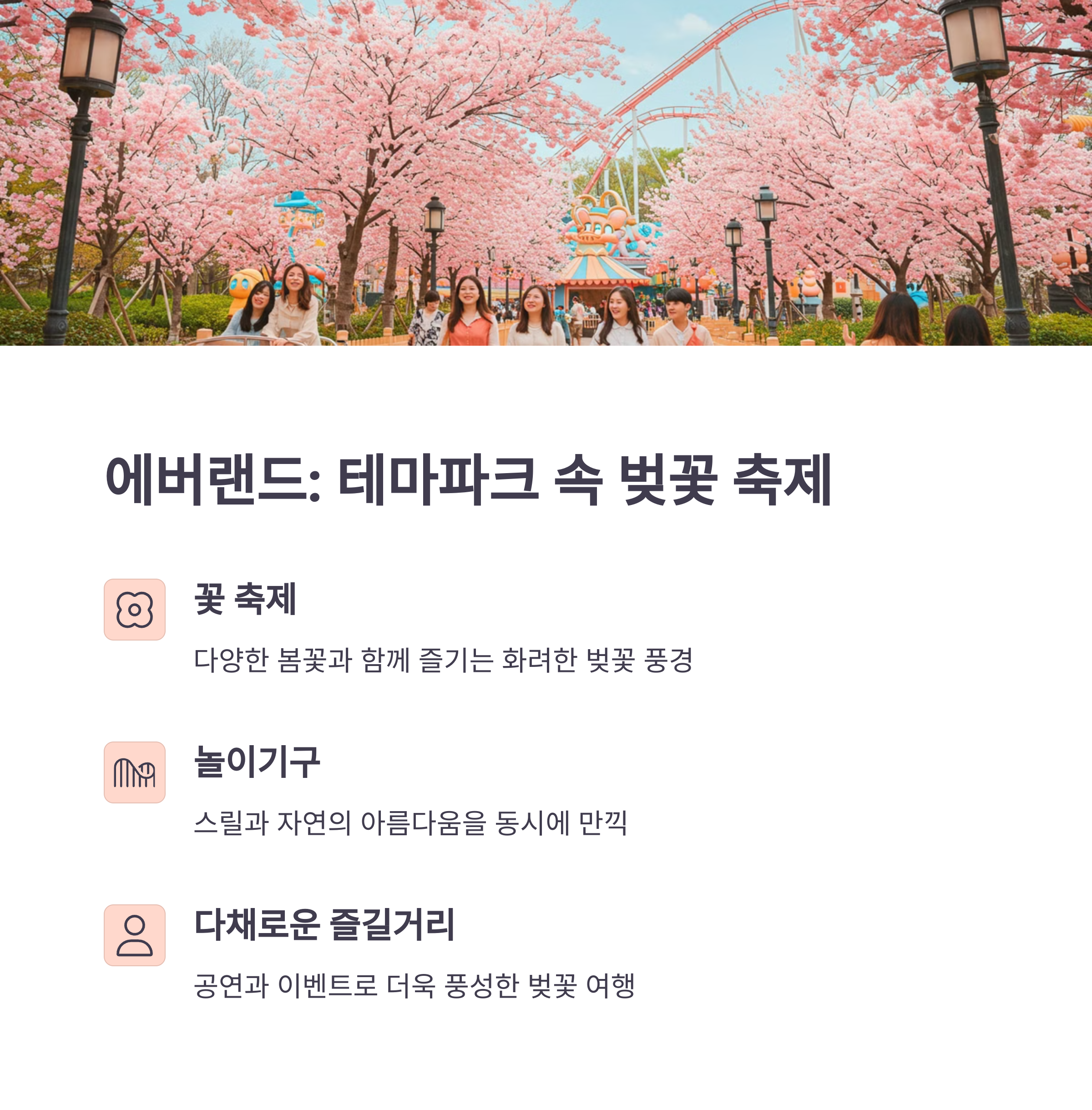 | 에버랜드 | 벚꽃 축제 이벤트 | 놀이기구, 공연 |