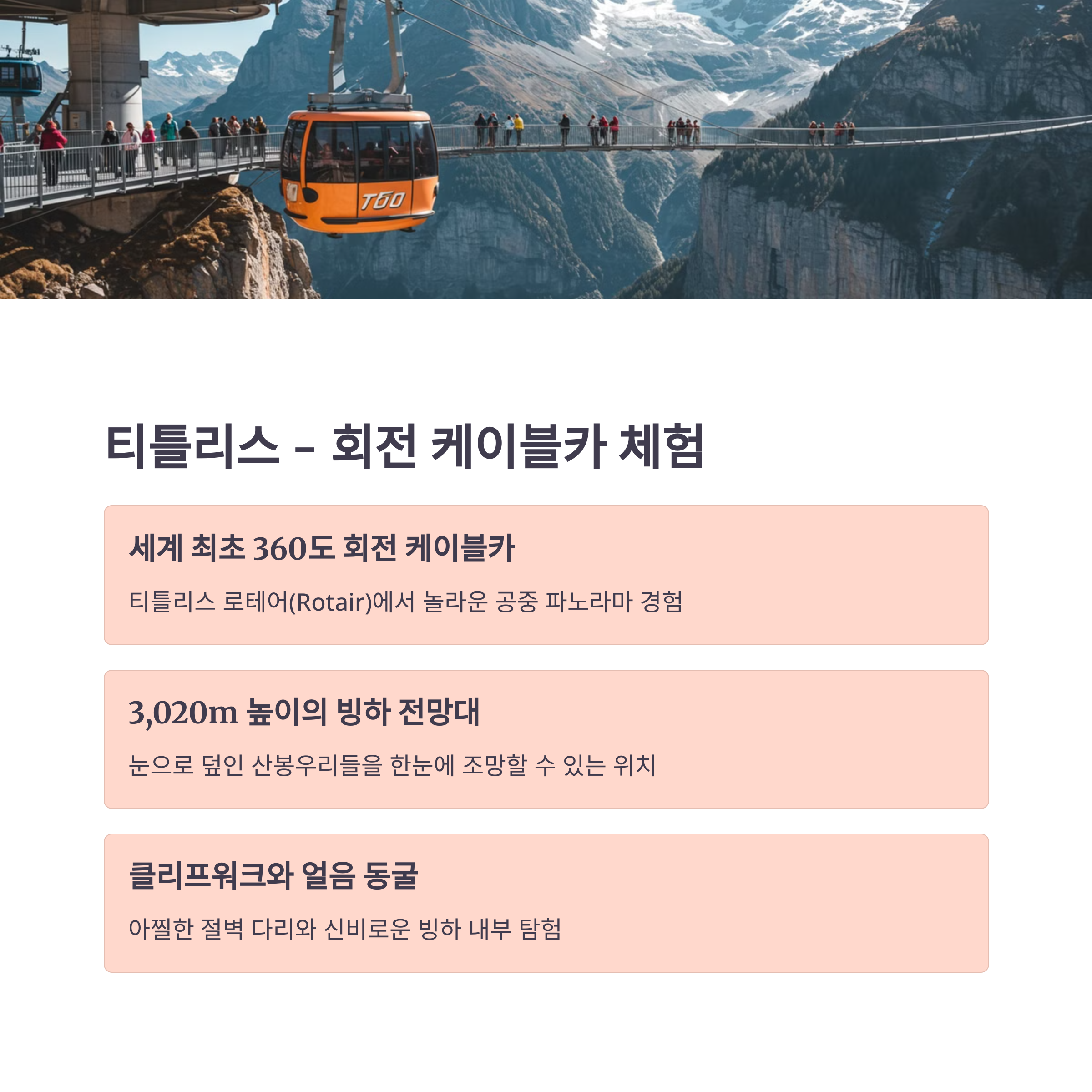 중부 스위스의 엥겔베르크 마을에서 세계 최초의 회전 케이블카인 로테어를 타고 올라갈 수 있는 티틀리스 산(3,238m)입니다.