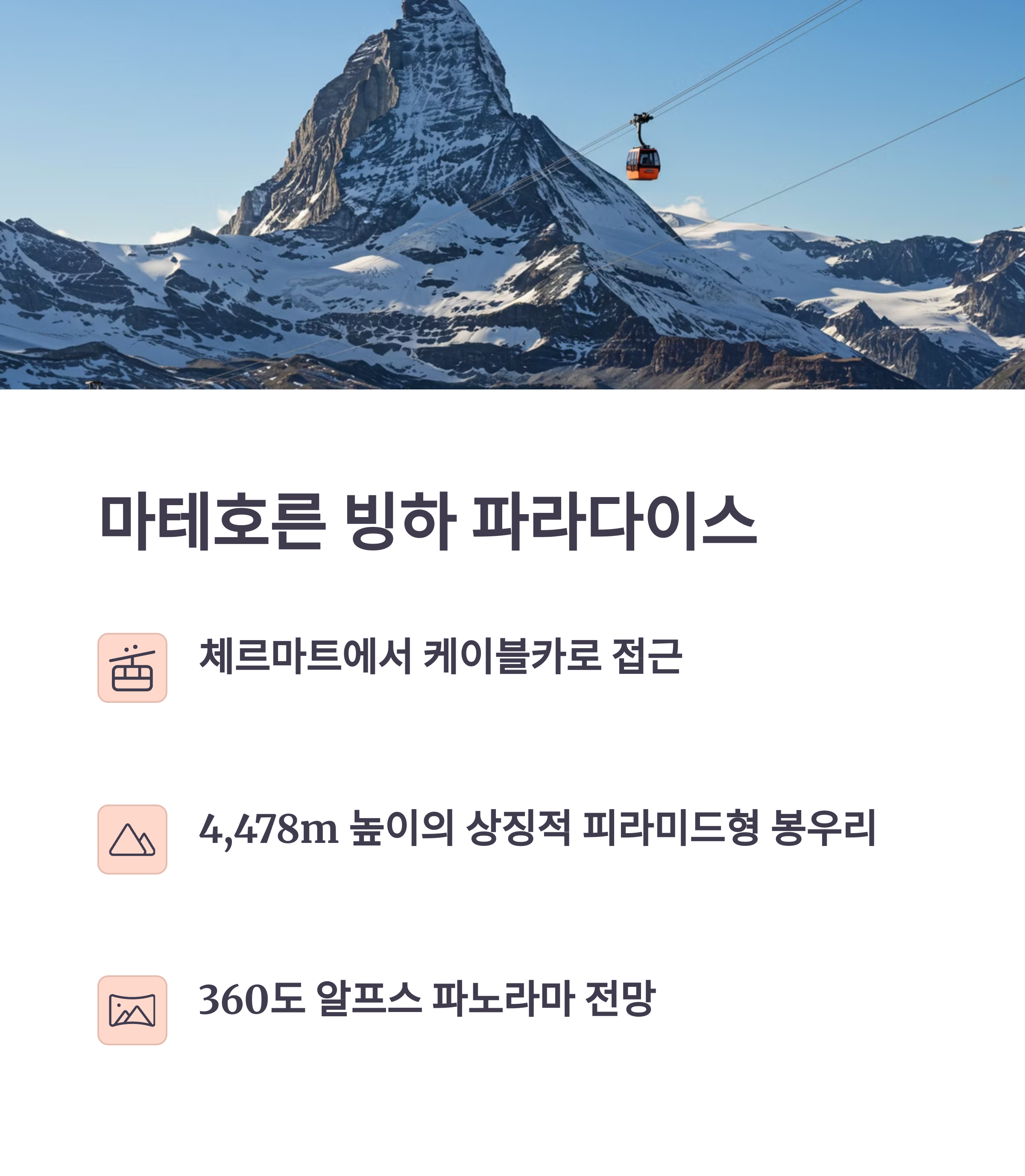 체르마트(Zermatt)에서 곤돌라와 케이블카를 타고 클라인 마테호른(3,883m)까지 오르면, 마테호른의 웅장한 피라미드형 실루엣을 바로 앞에서 감상할 수 있습니다.