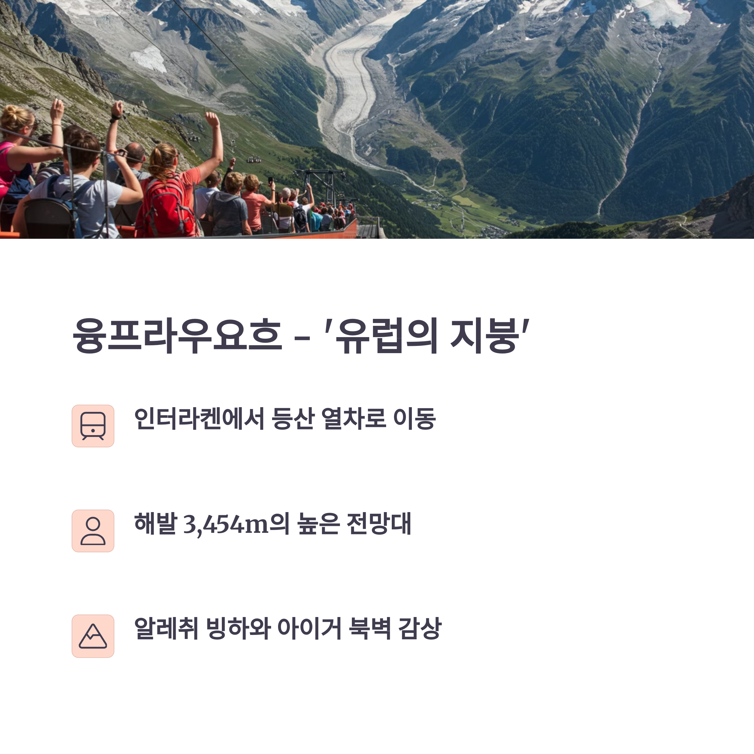 '유럽의 지붕'이라 불리는 융프라우요흐(3,454m)는 스위스 알프스 전망을 감상하는 가장 유명한 명소 중 하나입니다.