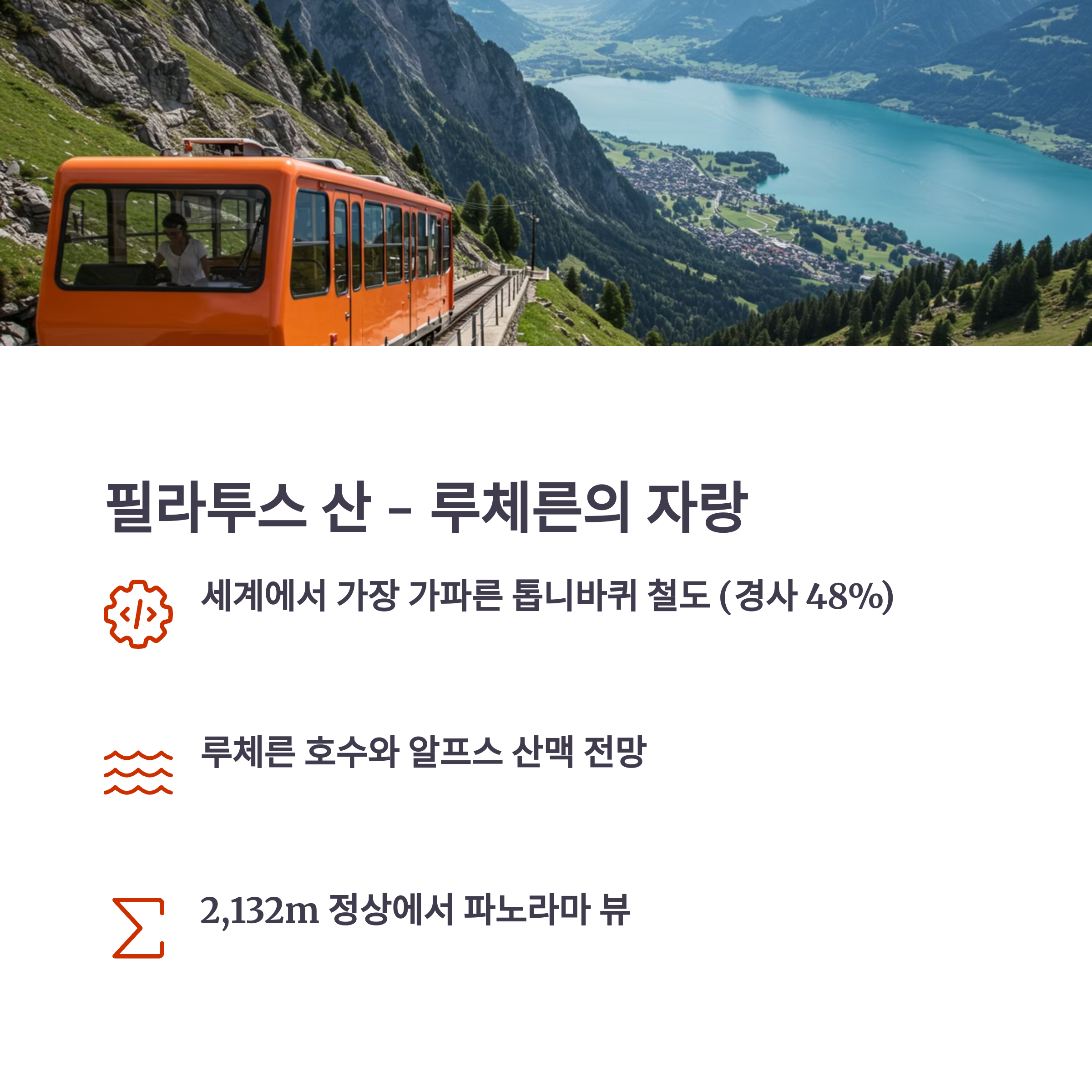 세계에서 가장 가파른 톱니바퀴 철도를 타고 산 정상까지 올라갈 수 있으며, 루체른 호수와 알프스 산맥의 환상적인 전망을 즐길 수 있습니다.