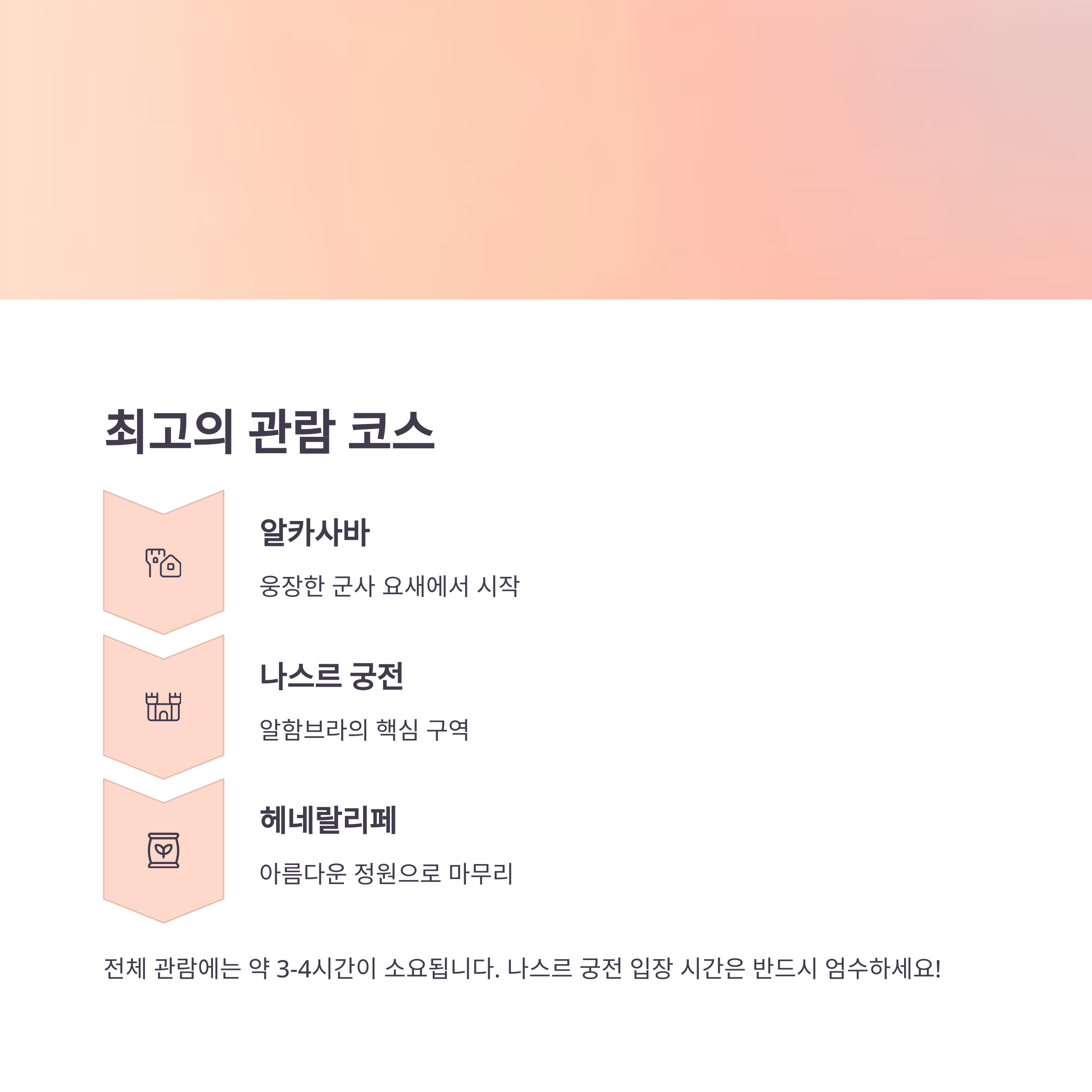 알함브라 궁전은 넓은 면적을 자랑하기 때문에 효율적인 관람 코스를 미리 계획하는 것이 중요해요. 전체 관람에는 보통 3-4시간이 소요되니 충분한 시간을 확보하세요.