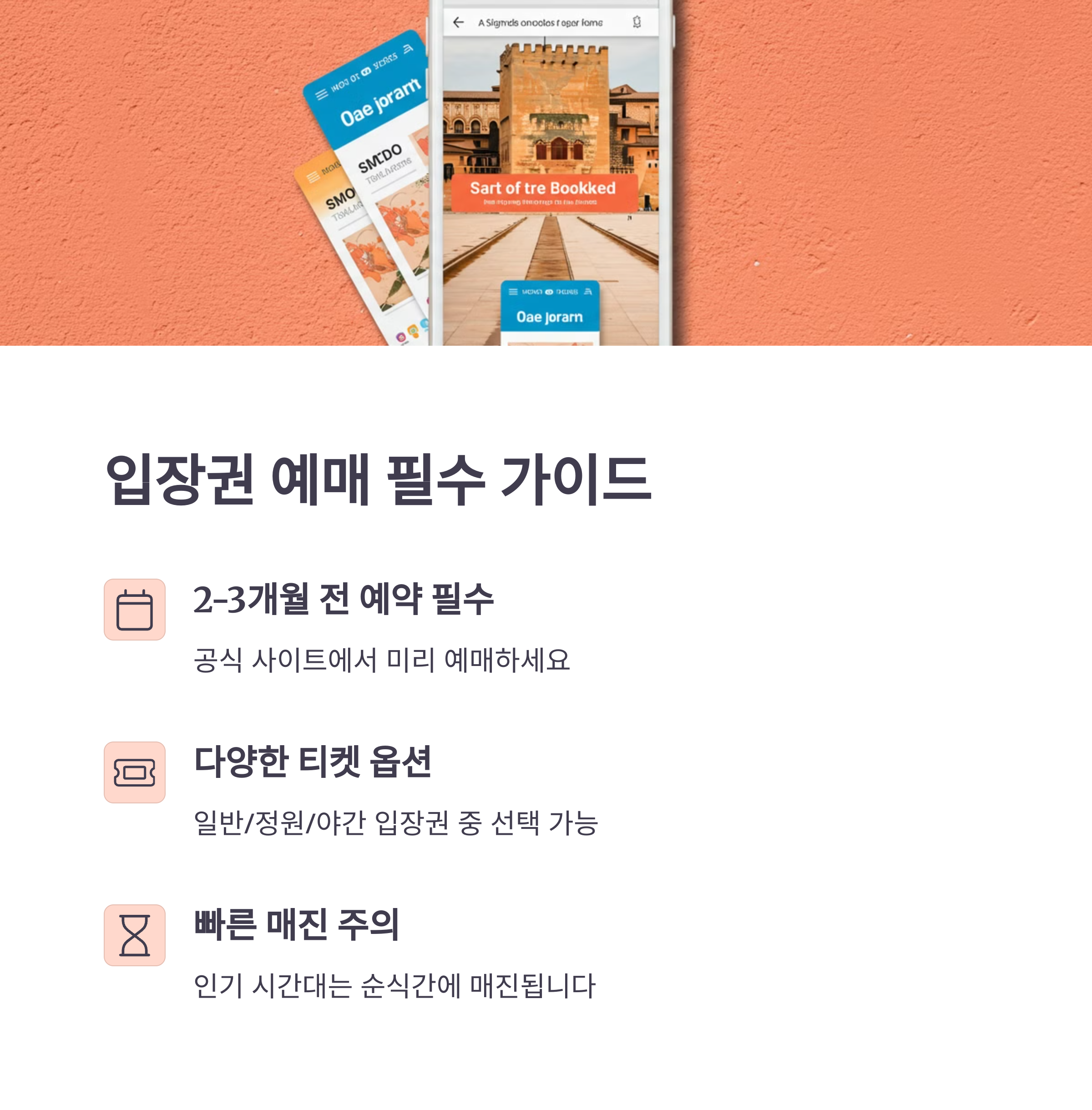| 알함브라 궁전 입장권은 얼마나 미리 예매해야 하나요? | 성수기(4-10월)에는 최소 2-3개월 전, 비수기에도 1개월 전에 예매하는 것이 안전합니다. |