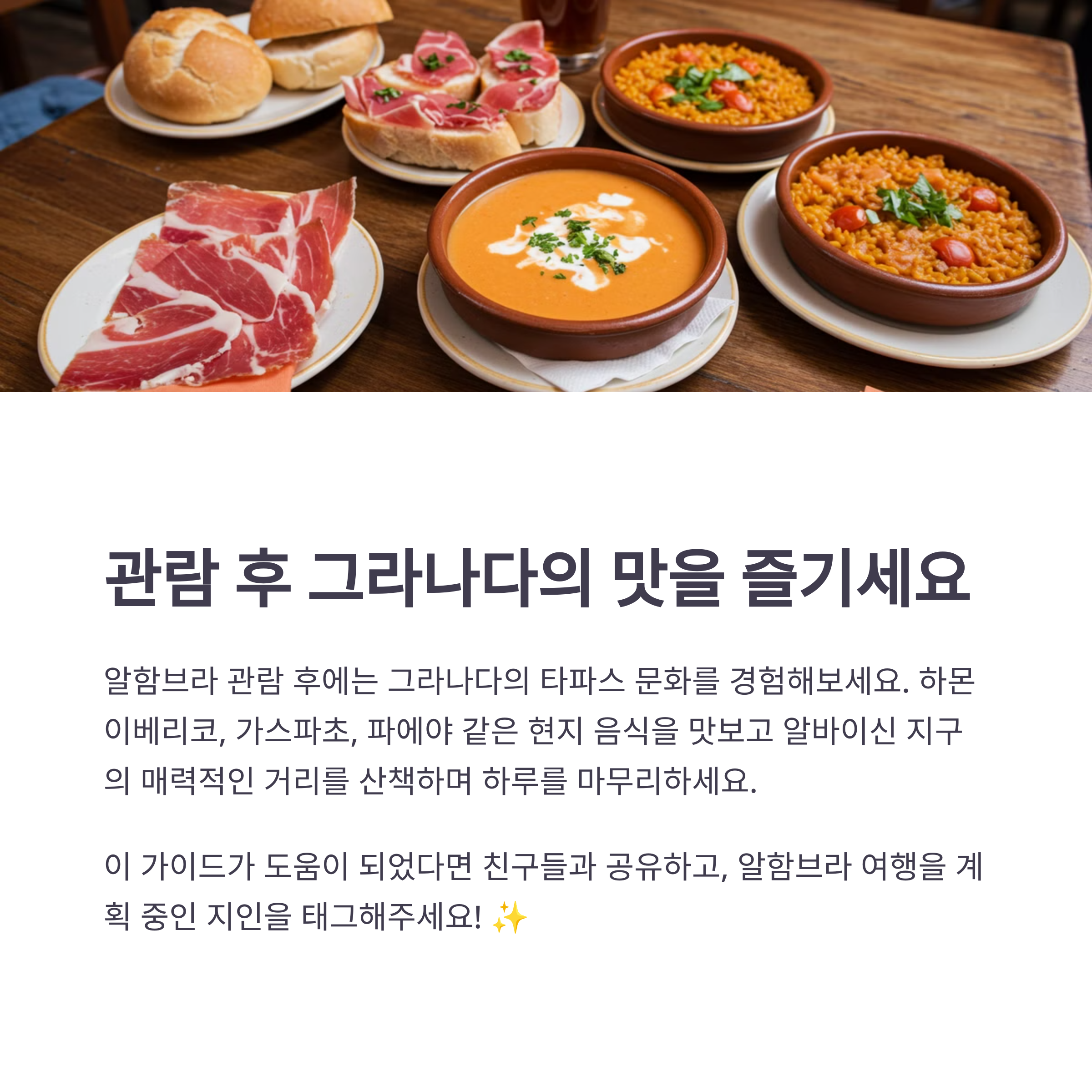 그럼 여러분의 그라나다 여행이 즐겁고 행복한 기억으로 가득하길 바랍니다! ¡Buen viaje! (좋은 여행되세요!)