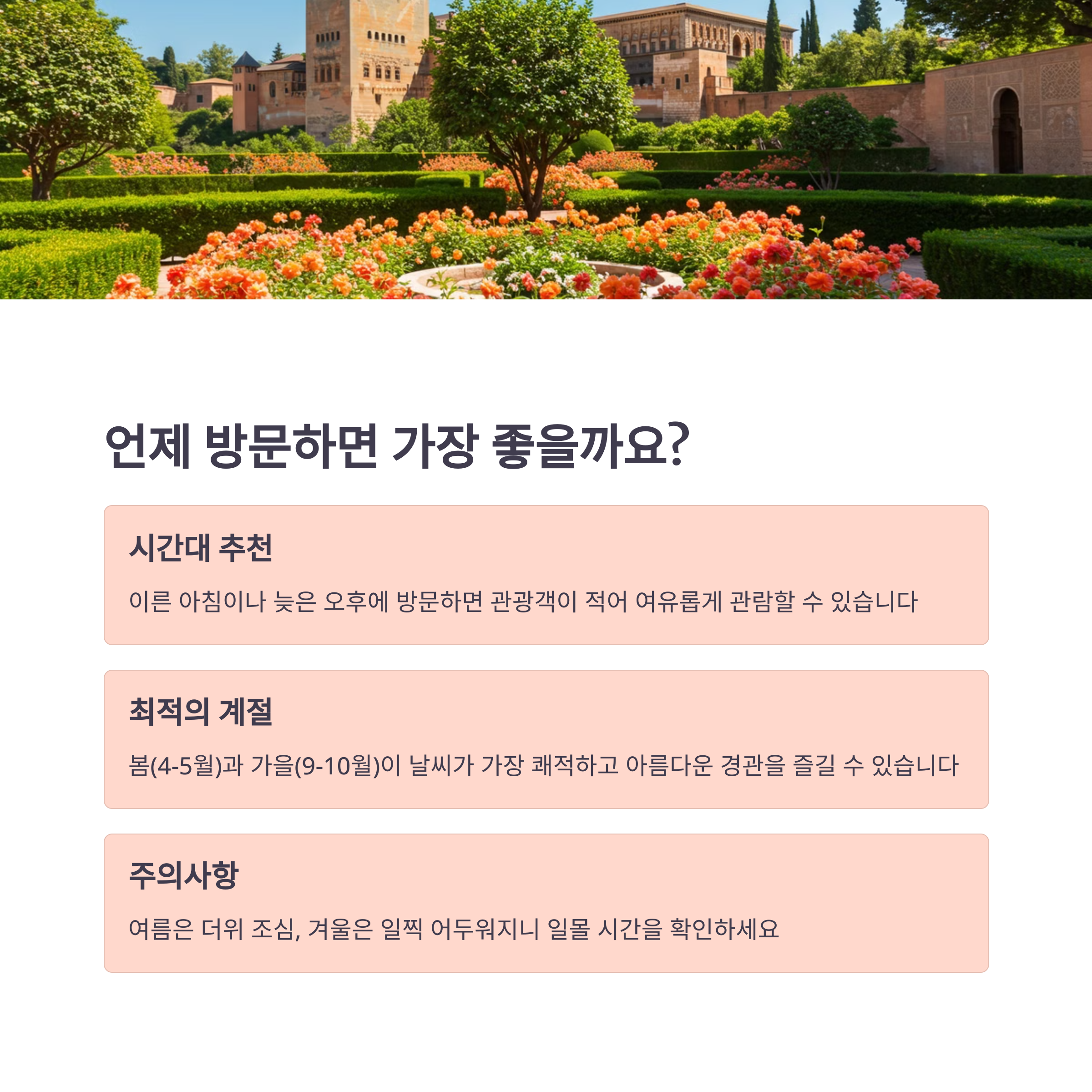 계절별로는 봄(4-5월)과 가을(9-10월)이 날씨가 가장 쾌적해요. 그라나다 날씨 정보를 미리 확인하는 것도 잊지 마세요.