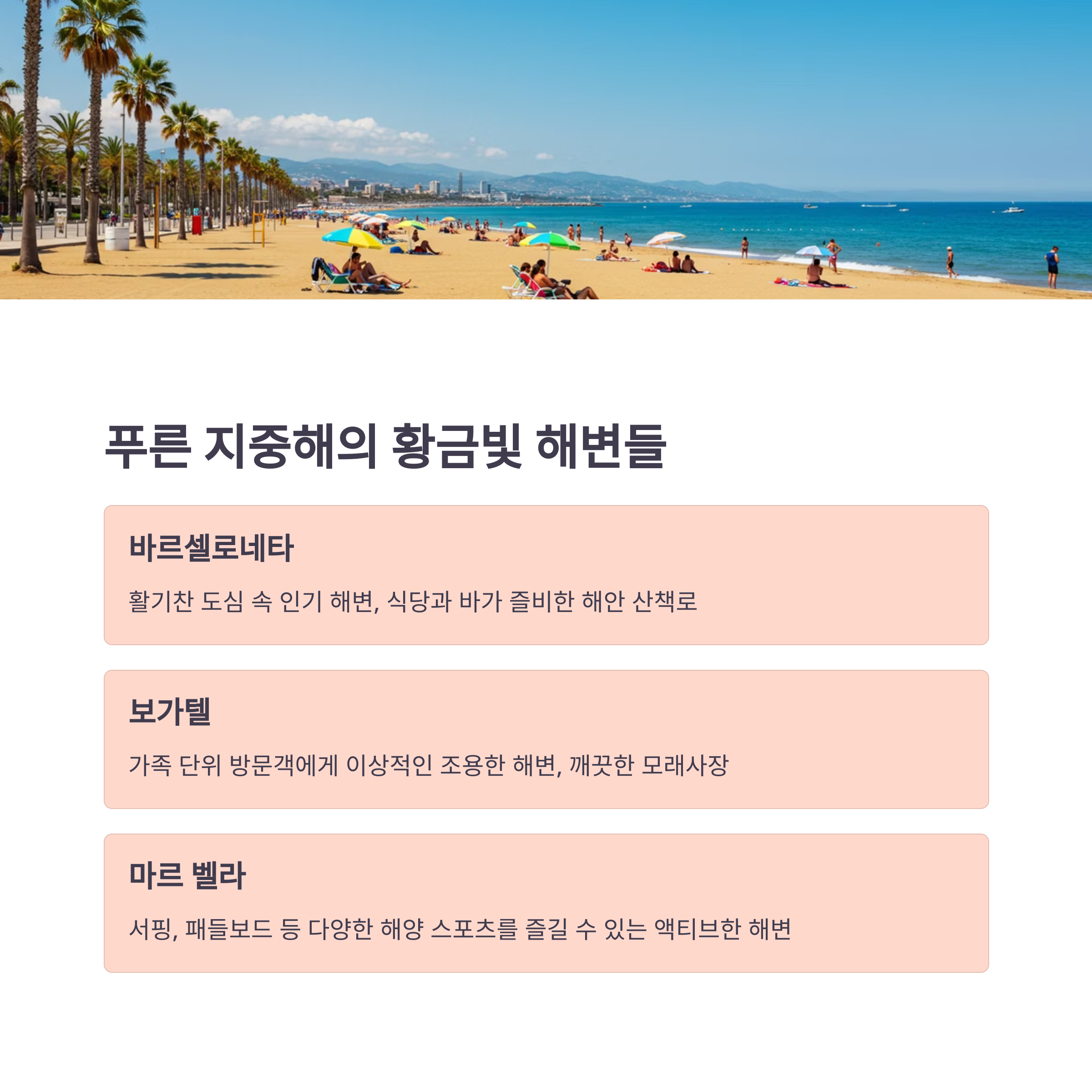 바르셀로네타 해변(Barceloneta Beach)은 가장 유명하고 접근성이 좋은 해변으로, 관광객과 현지인 모두에게 인기가 많아요.