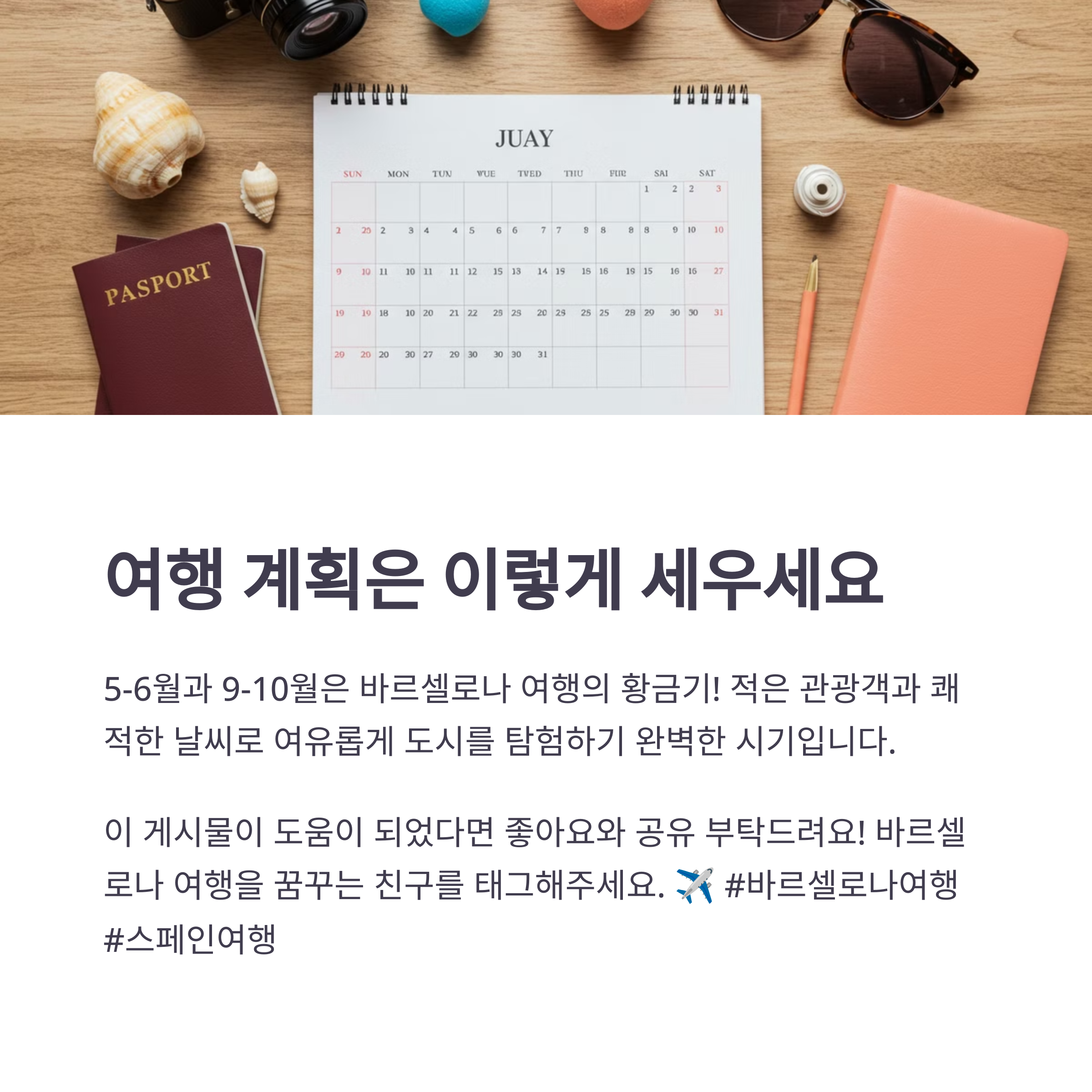 바르셀로나 여행의 최적의 시기는 5월부터 6월, 9월부터 10월까지로, 날씨가 너무 덥지 않으면서 관광객이 상대적으로 적은 시기예요.