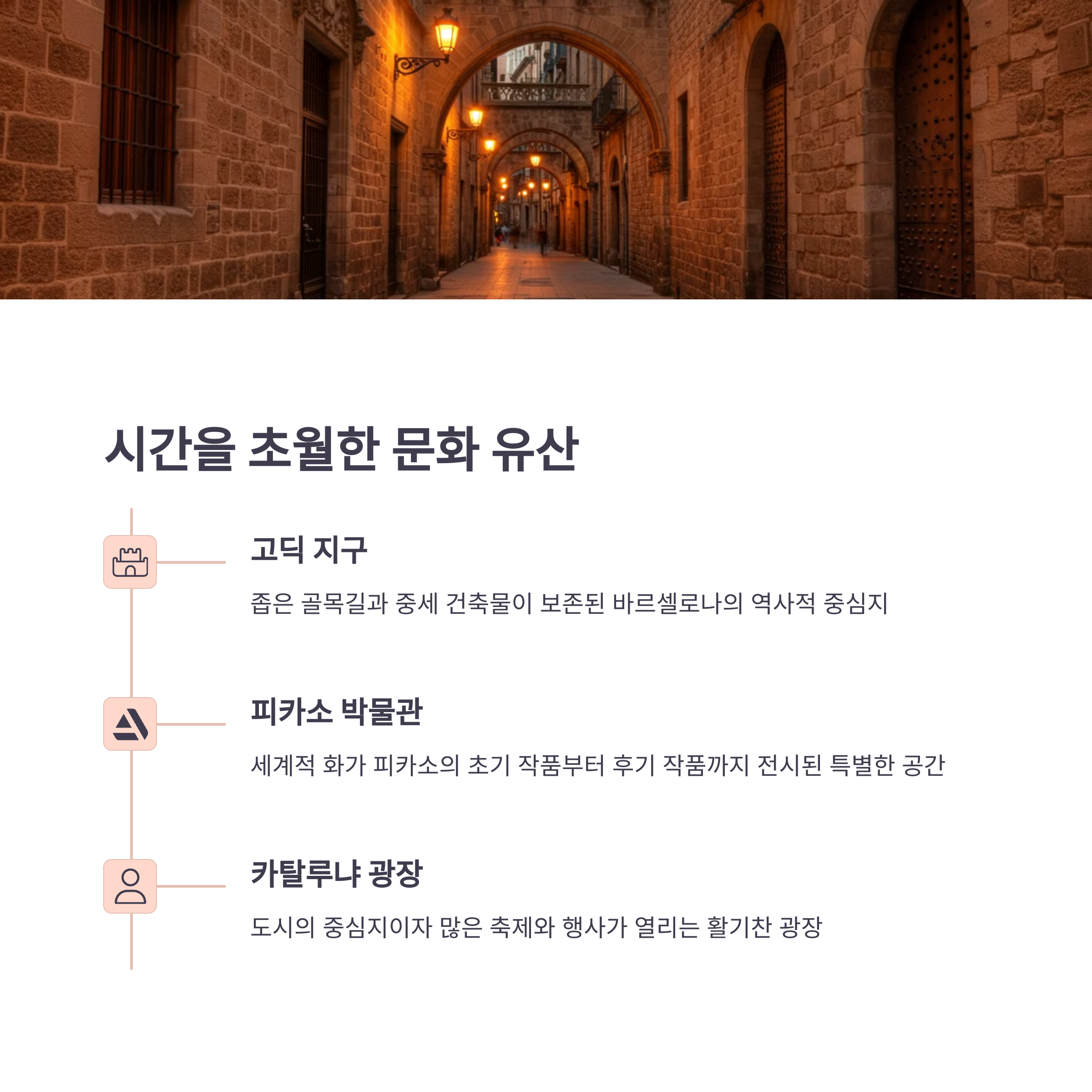 고딕 지구(Gothic Quarter)는 바르셀로나의 중세 시대 건축물과 좁은 골목길을 탐험할 수 있는 지역이에요.