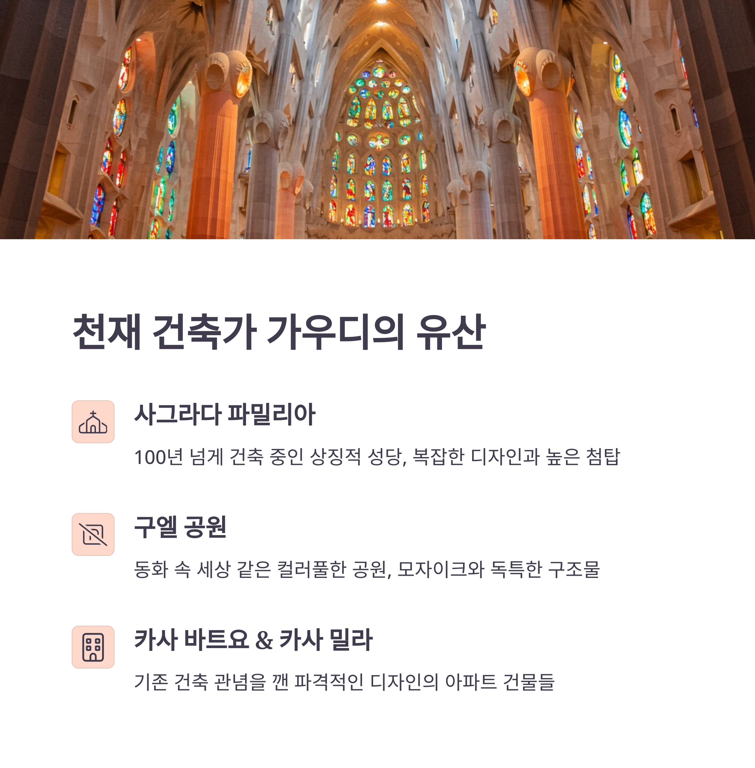 💡 팁: 가우디 건축물들은 인기가 많아 줄이 길게 늘어서는 경우가 많으니, 반드시 온라인으로 미리 티켓을 예매하세요!
