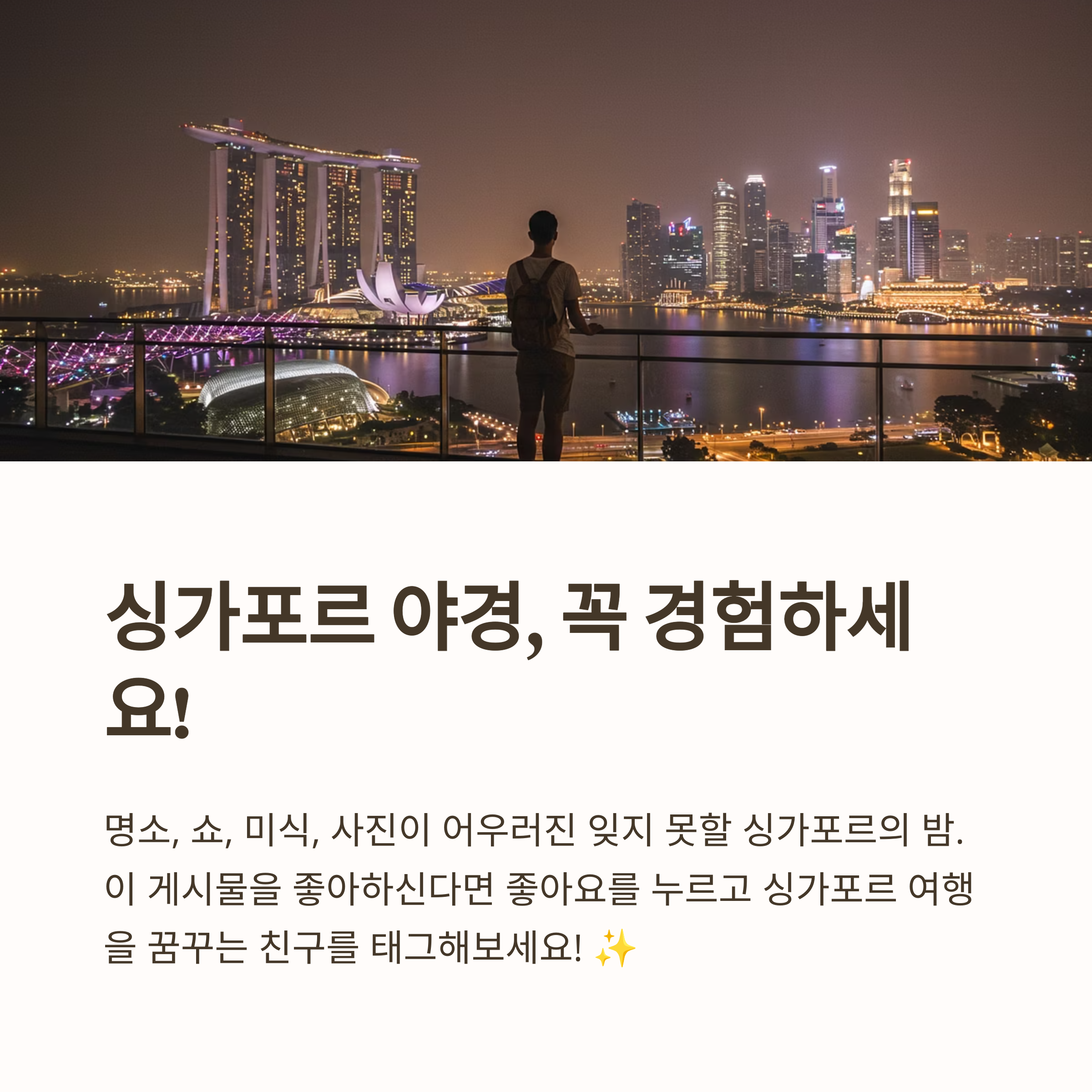 싱가포르 여행을 계획하고 계신다면, 꼭 하루 저녁은 마리나베이의 야경을 위해 시간을 내보세요. 낮과는 또 다른 매력의 싱가포르를 만날 수 있을 거예요. 여러분의 여행이 빛나는 추억으로 가득하길 바랍니다! ✨