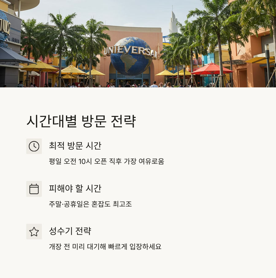 유니버설스튜디오를 최대한 즐기려면 방문 시간대를 전략적으로 선택하는 것이 중요해요. 시간대에 따라 대기 시간이 크게 달라질 수 있거든요.