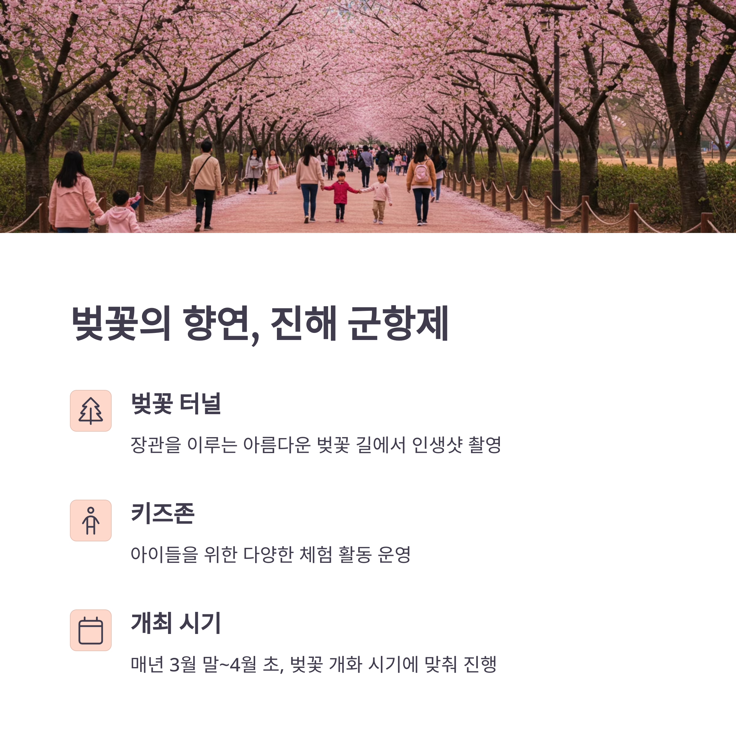 특히 아이들이 좋아하는 진해 중원로터리의 벚꽃 터널은 꼭 방문해야 할 명소예요.