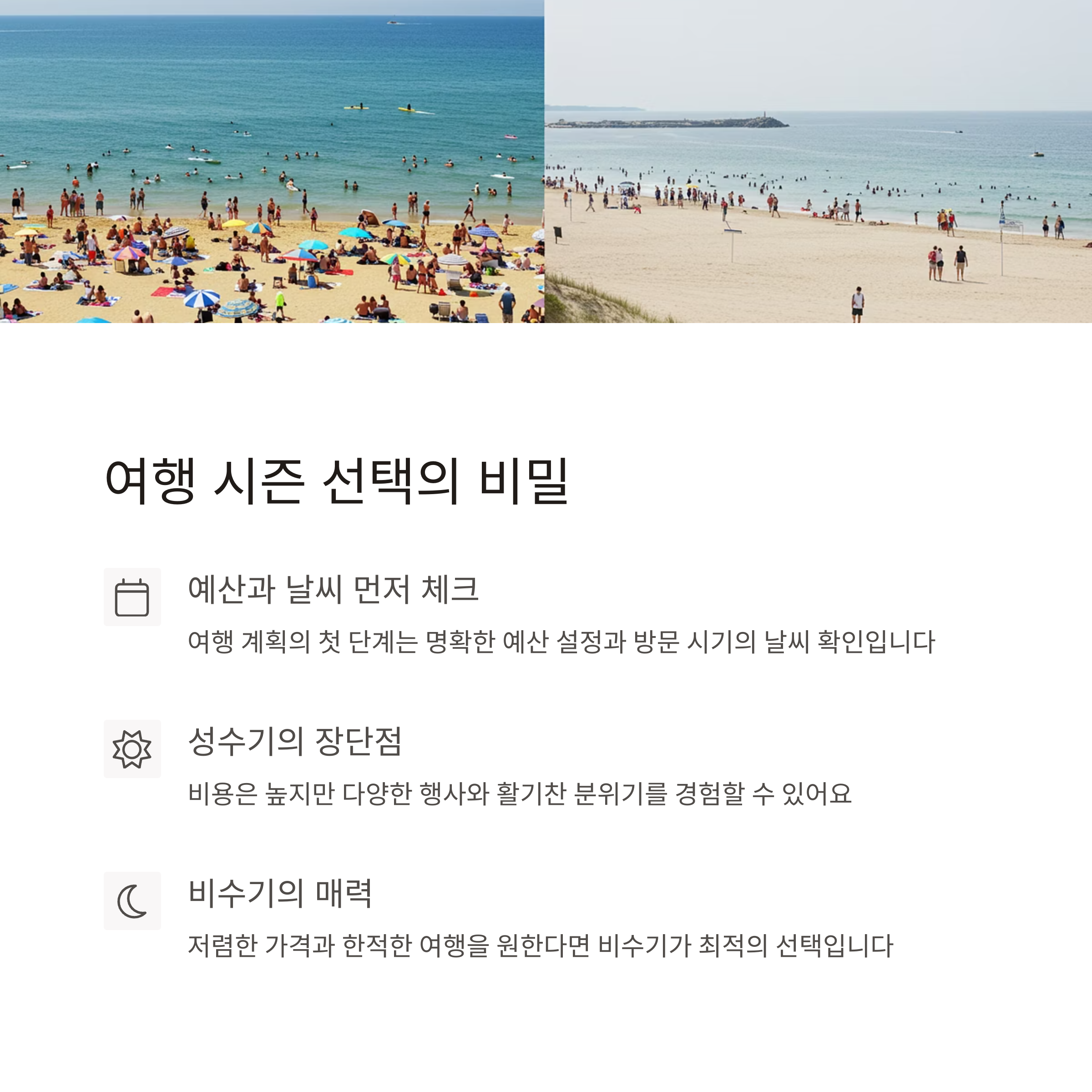 또한 **여행 시즌**도 중요해요! 성수기에는 모든 것이 비싸고 사람도 많지만, 비수기에는 한적하게 저렴한 가격으로 여행할 수 있어요.
