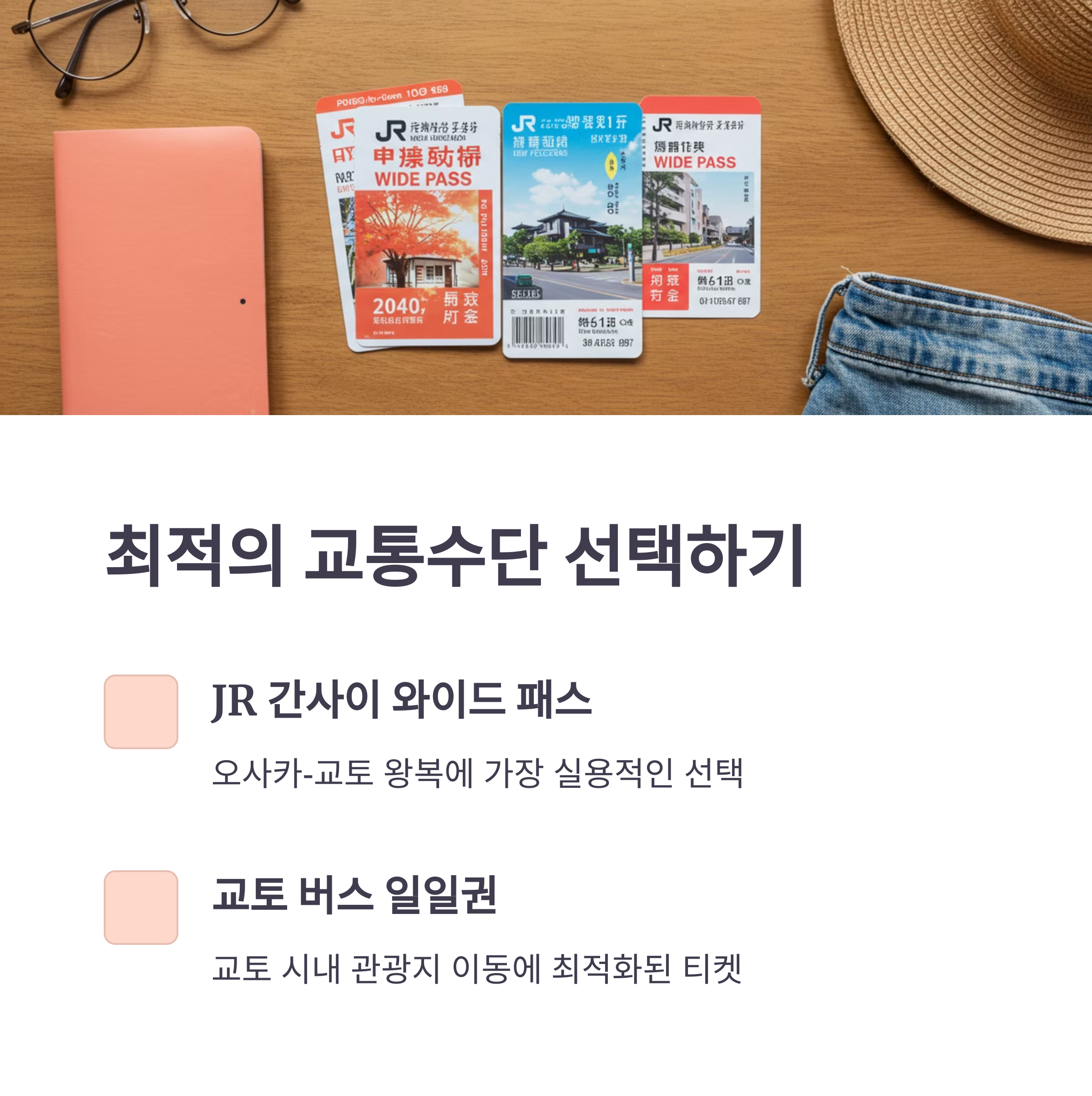 오사카와 교토 여행에서 가장 중요한 것은 교통 패스를 잘 선택하는 것입니다. JR 간사이 와이드 패스는 간사이 지역의 JR 노선을 무제한으로 이용할 수 있어 매우 실용적입니다. 하지만 교토 시내 이동에는 버스나 지하철이 필요할 수 있어요.