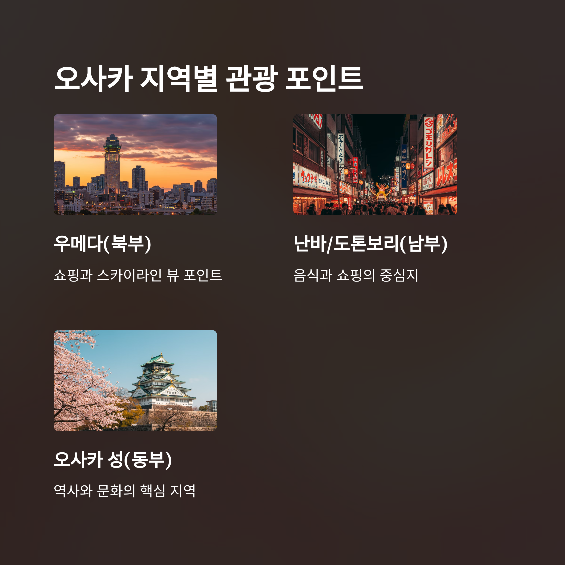 오사카의 관광지는 크게 우메다(북부), 난바/도톤보리(남부), 그리고 오사카 성 주변(동부)으로 나눌 수 있습니다. 이 세 지역을 중심으로 효율적인 동선을 계획하는 것이 시간을 절약하는 방법입니다.