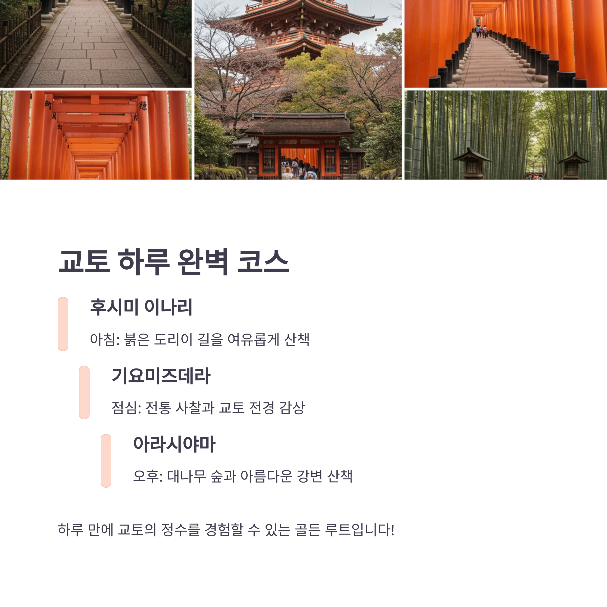 | 교토를 하루만에 둘러볼 수 있을까요? | 완벽하게 둘러보기는 어렵지만, 후시미 이나리→기요미즈데라→아라시야마 코스로 주요 명소를 방문할 수 있습니다. 아침 일찍 출발하는 것이 좋습니다. |