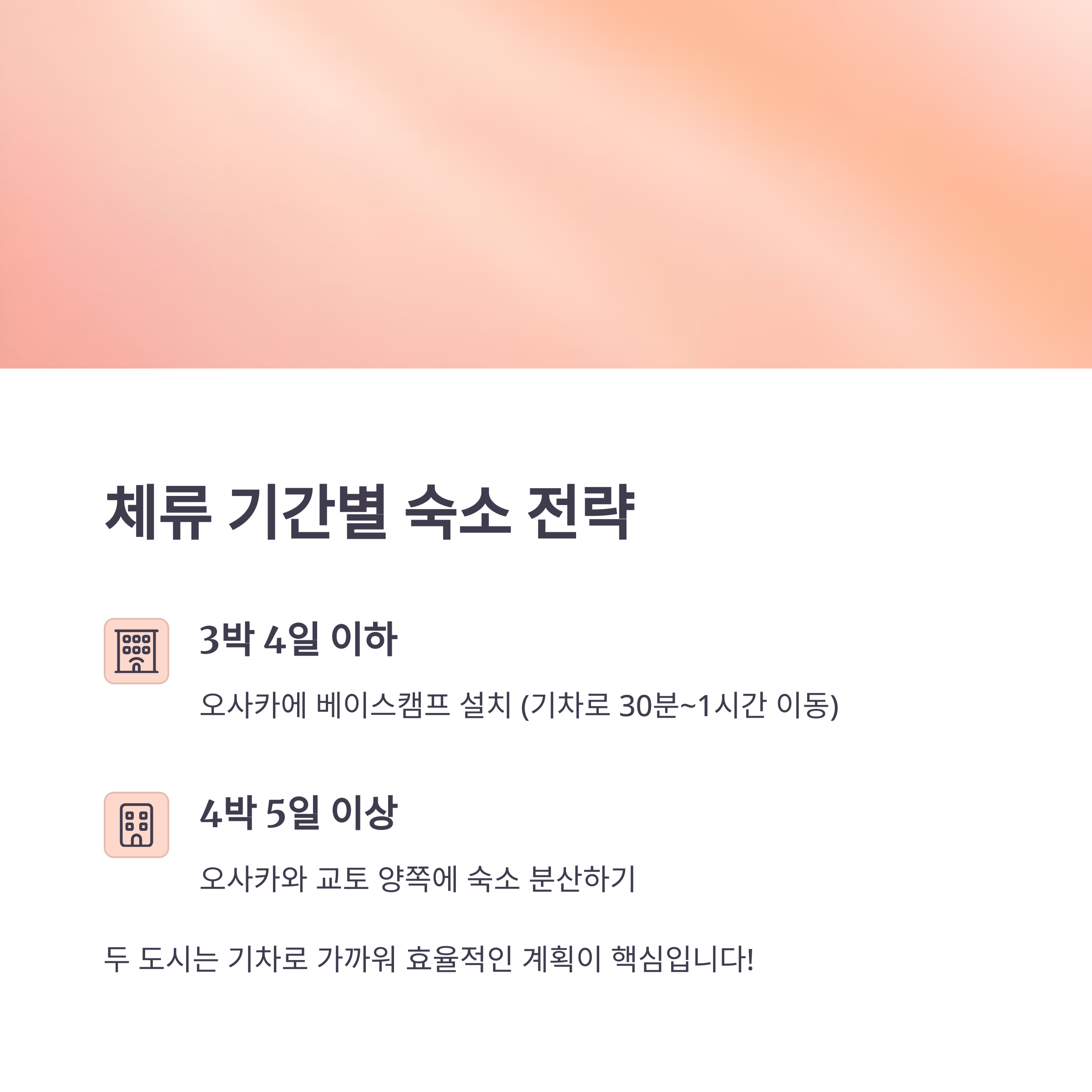 효율적인 여행을 위해서는 숙소 위치 선정이 중요한데요. 3박 4일 이하의 짧은 일정이라면 오사카 우메다나 난바 지역에 숙소를 잡는 것이 좋습니다. 4박 5일 이상이라면 오사카와 교토에 각각 숙소를 잡는 것도 고려해볼 만 합니다.